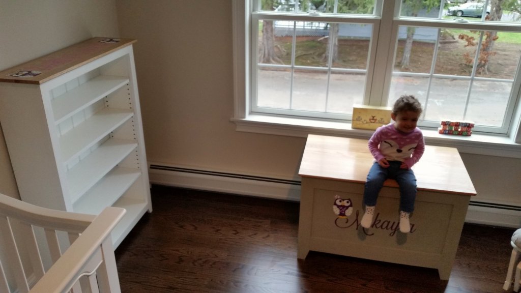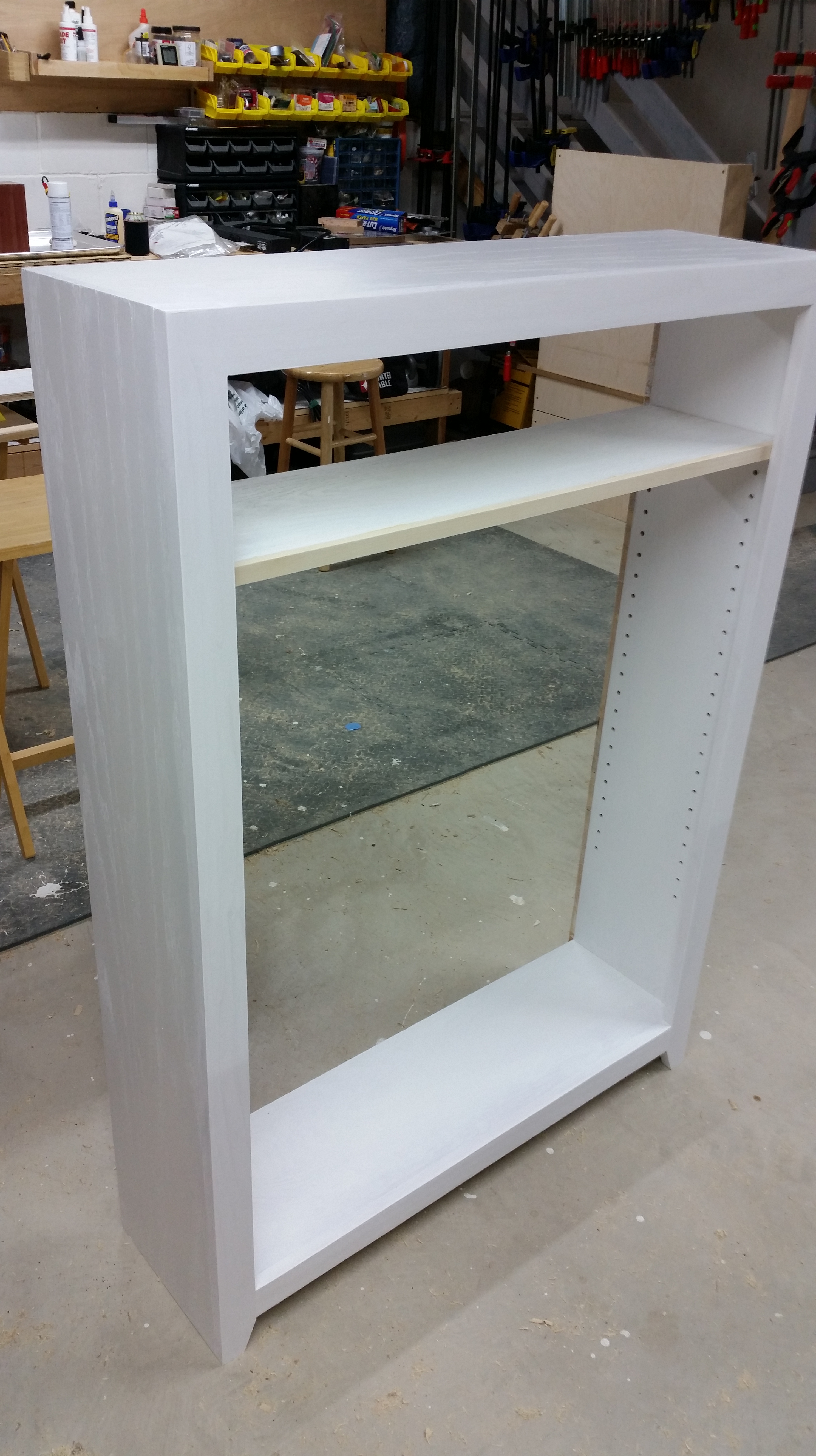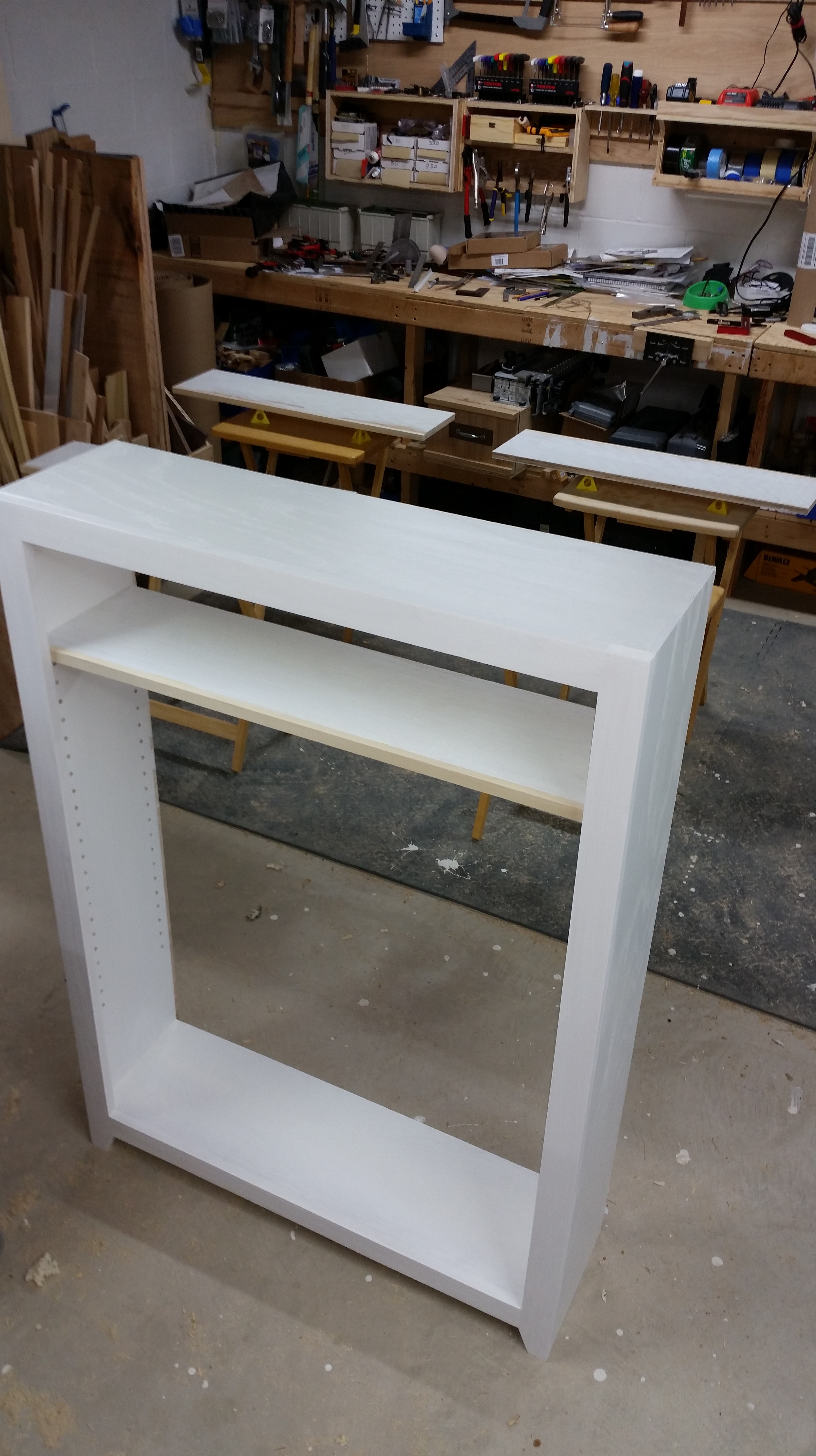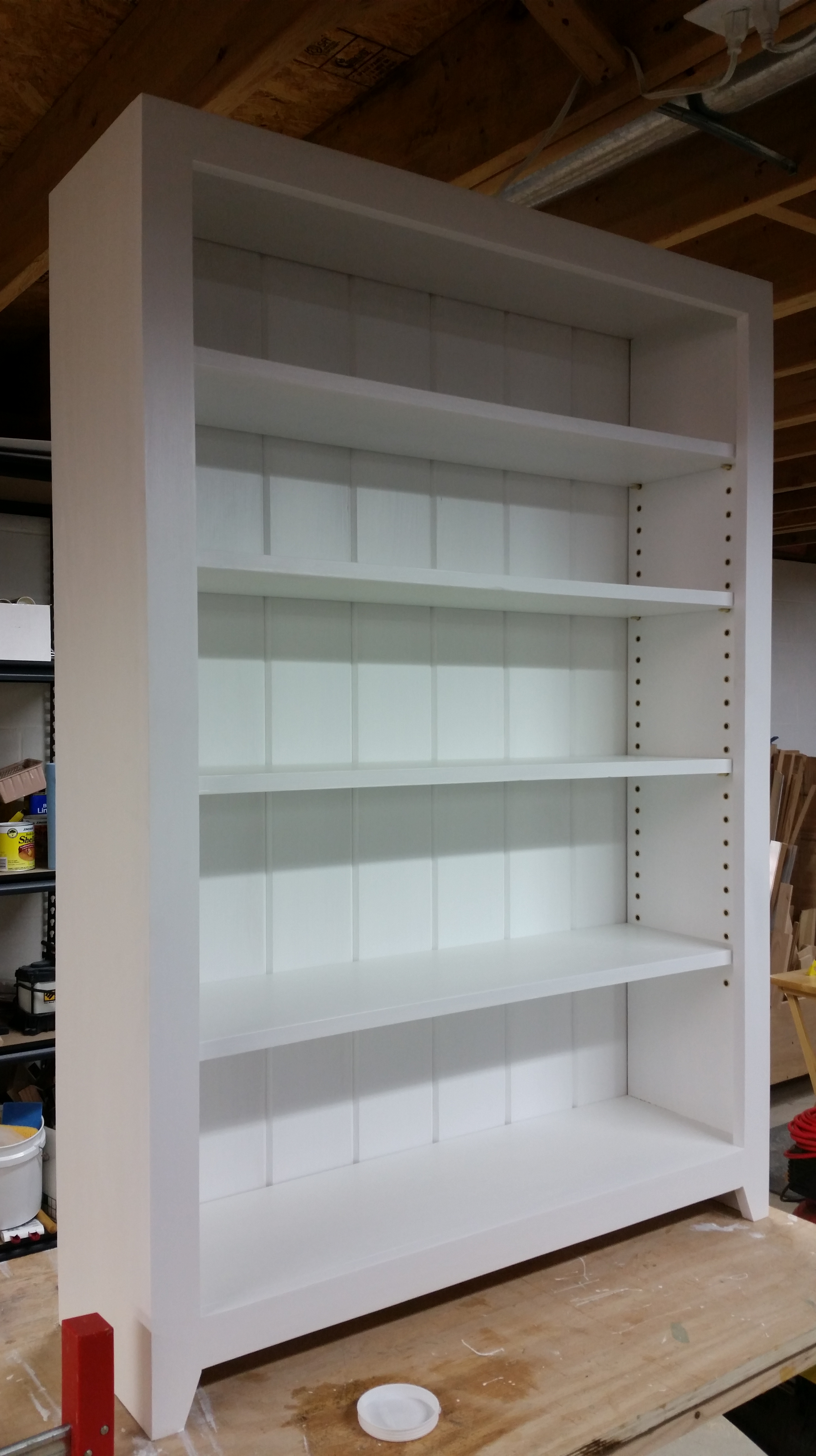 This a bookcase I made for my niece in December of 2015. It is made out of Popular with and Oak top and pine beadboard for the back. The body is painted with white latex paint and the top is clear water-based acrylic.
