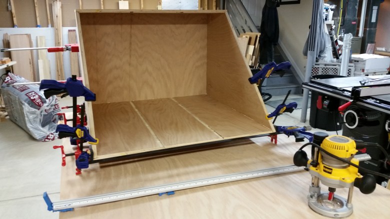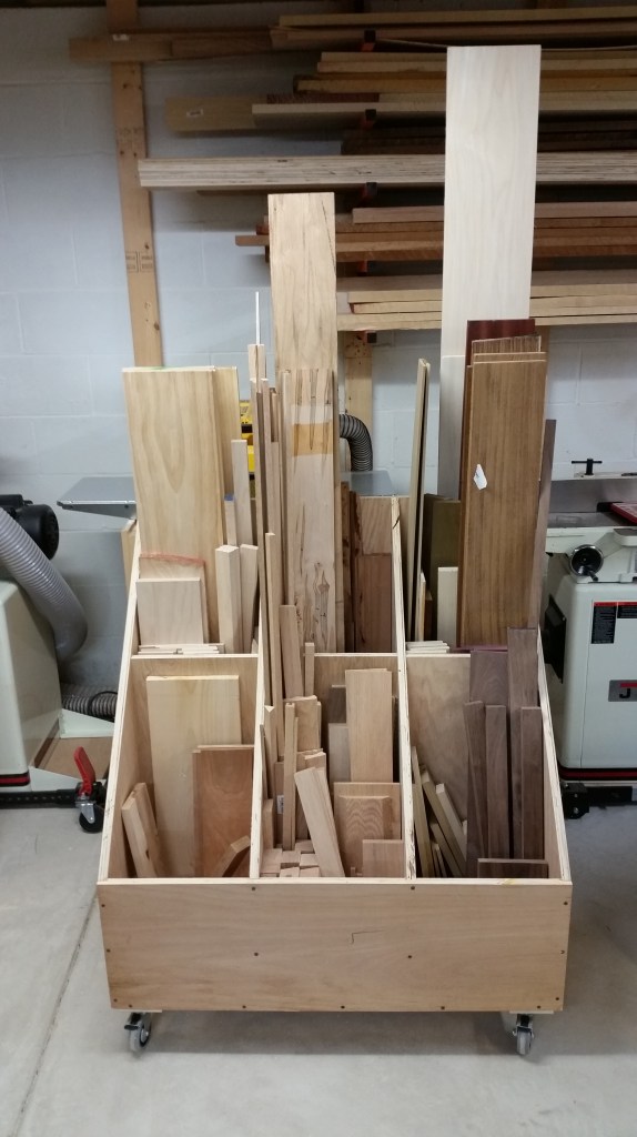 I built this cutoff bin in October of 2014. I was getting quite the supply of cutoffs that were in stacks all around my shop, so I needed something like this to hold them all. It was a design inspired by one created by Steve Ramsey of Woodworking for Mere Mortals. The side to side dividers are held in place by friction so I can move them if needed.
