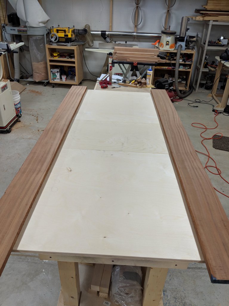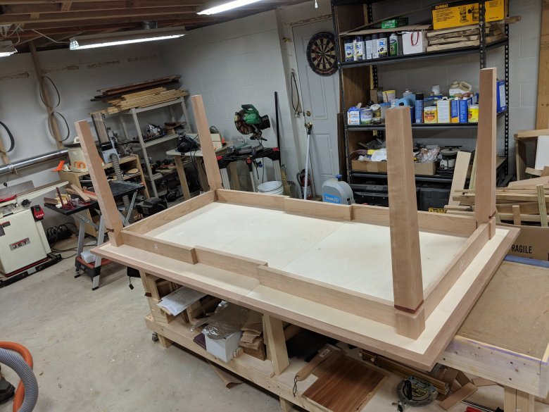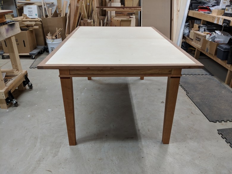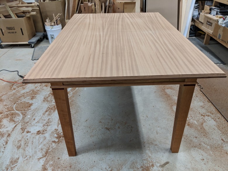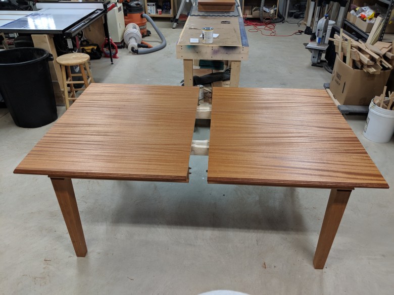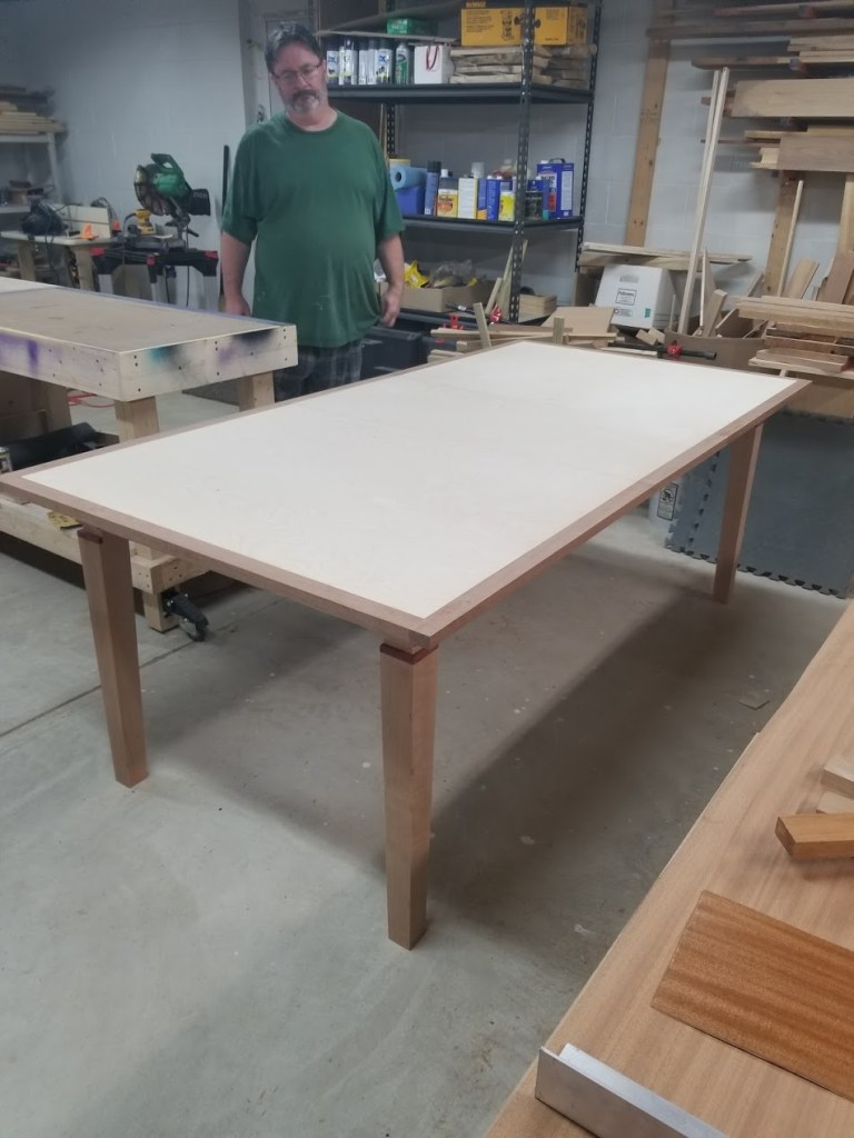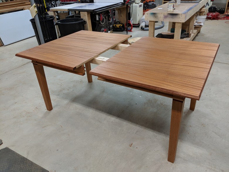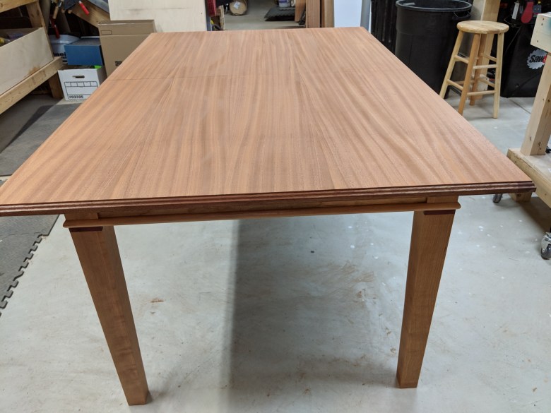 Here is my Sapele top and Cherry base dining table. It has one leaf so it can seat six or either people. The strip around the top of the legs is Bloodwood. I finished it on November 11, 2018. Now I just have to make chairs for it. This was adapted from plans in Woodsmith magazine.