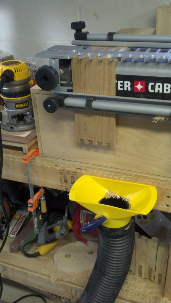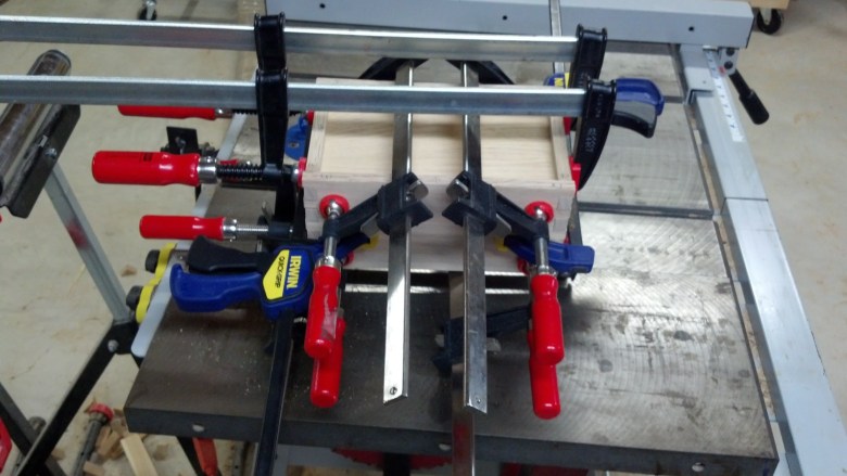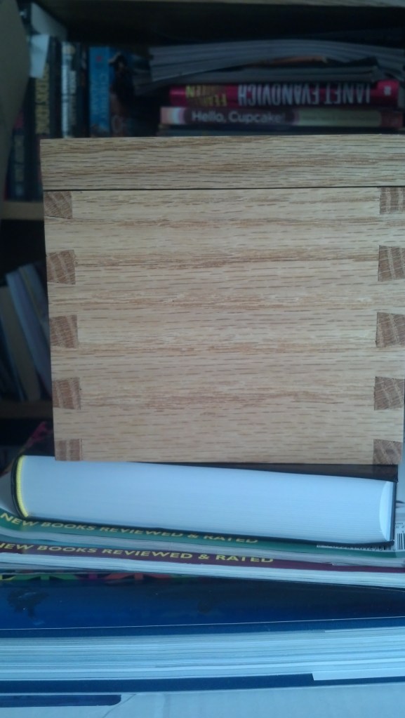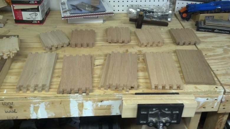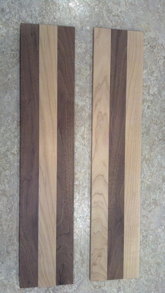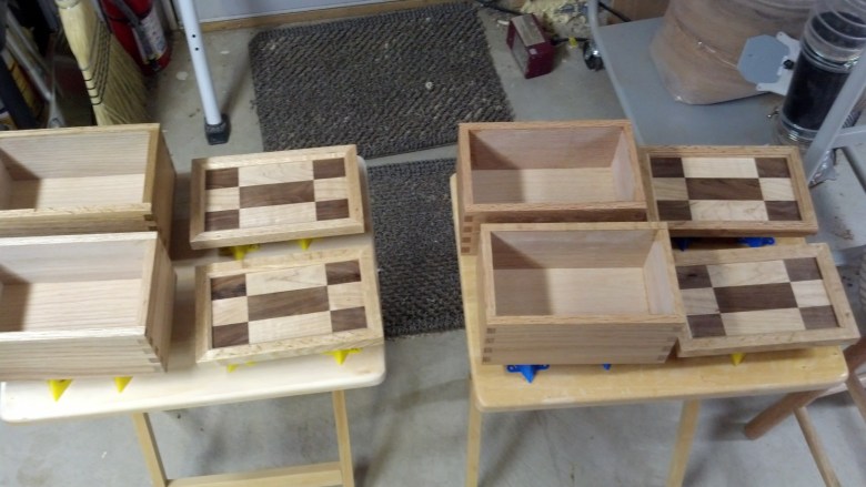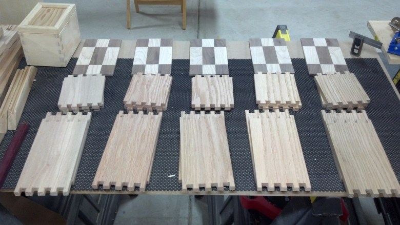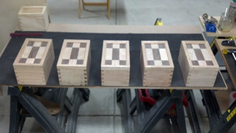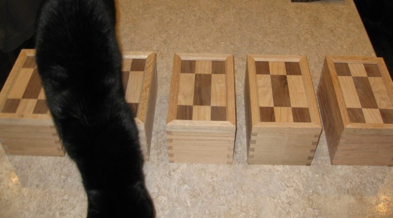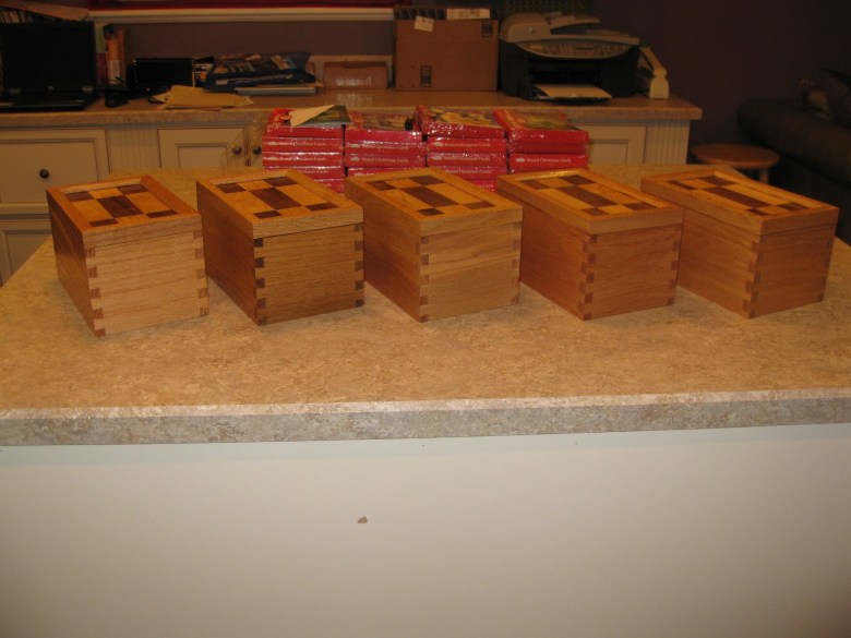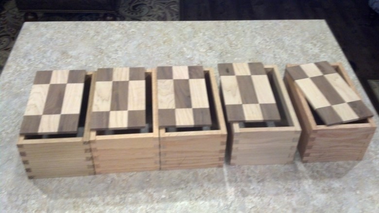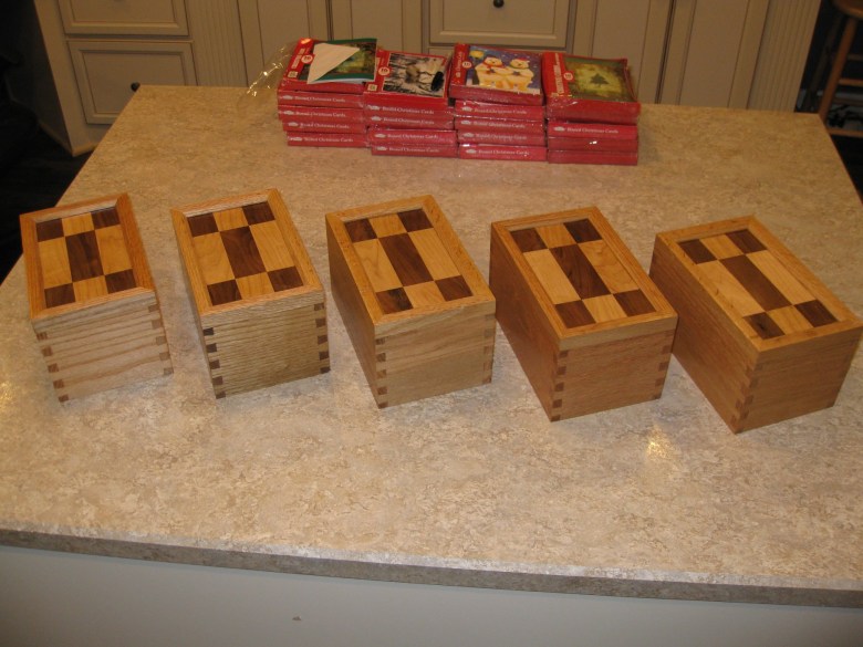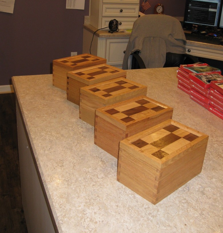 This is a set of dovetailed gift boxes I made for my mother-in-law in December of 2013. The tops are Maple and Walnut panels I created with the body made from Oak.