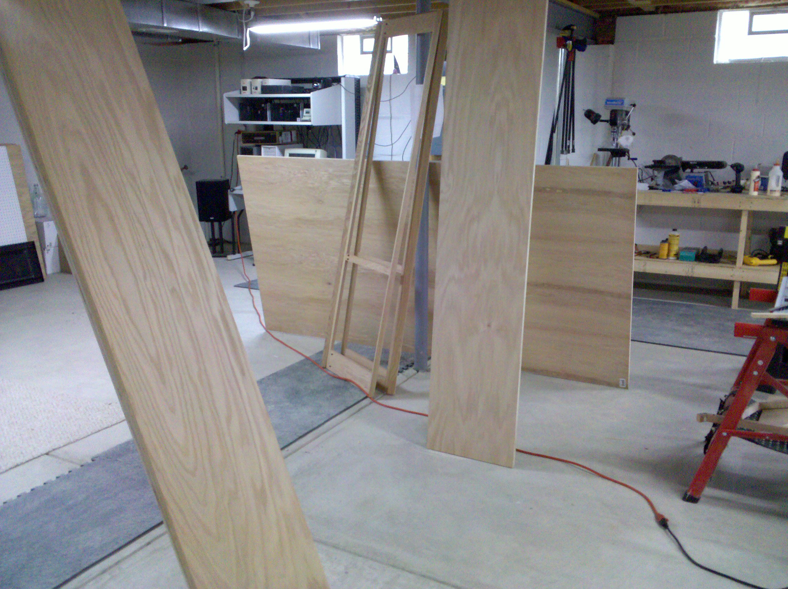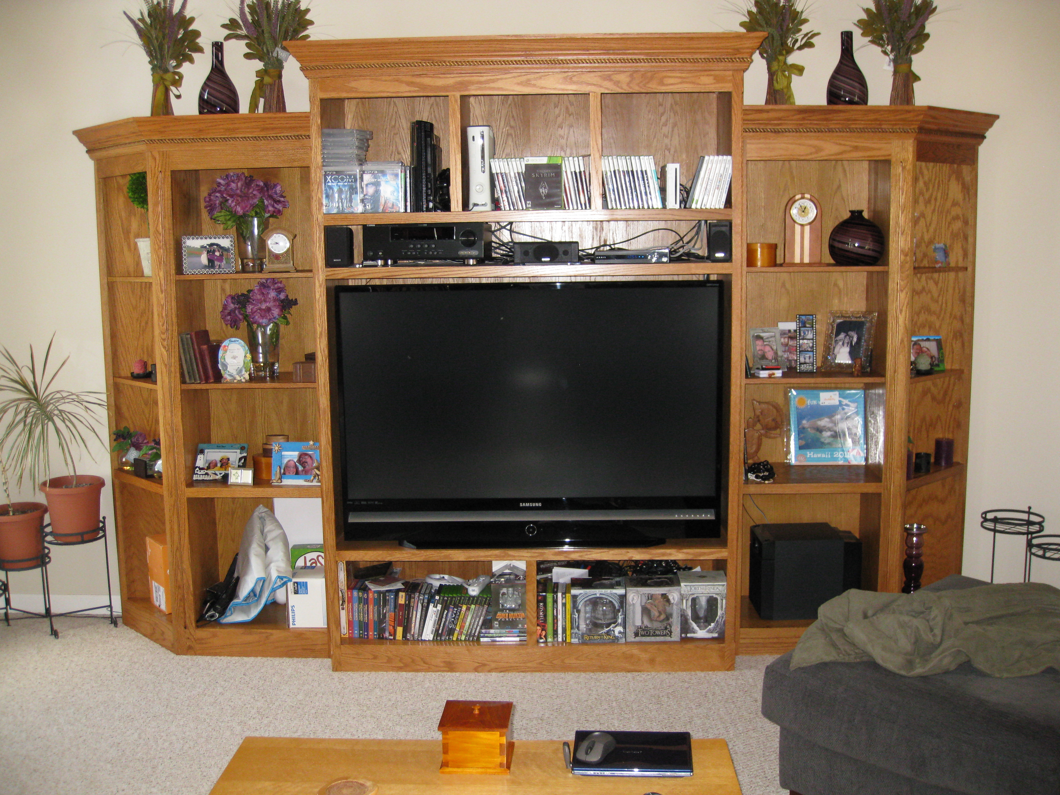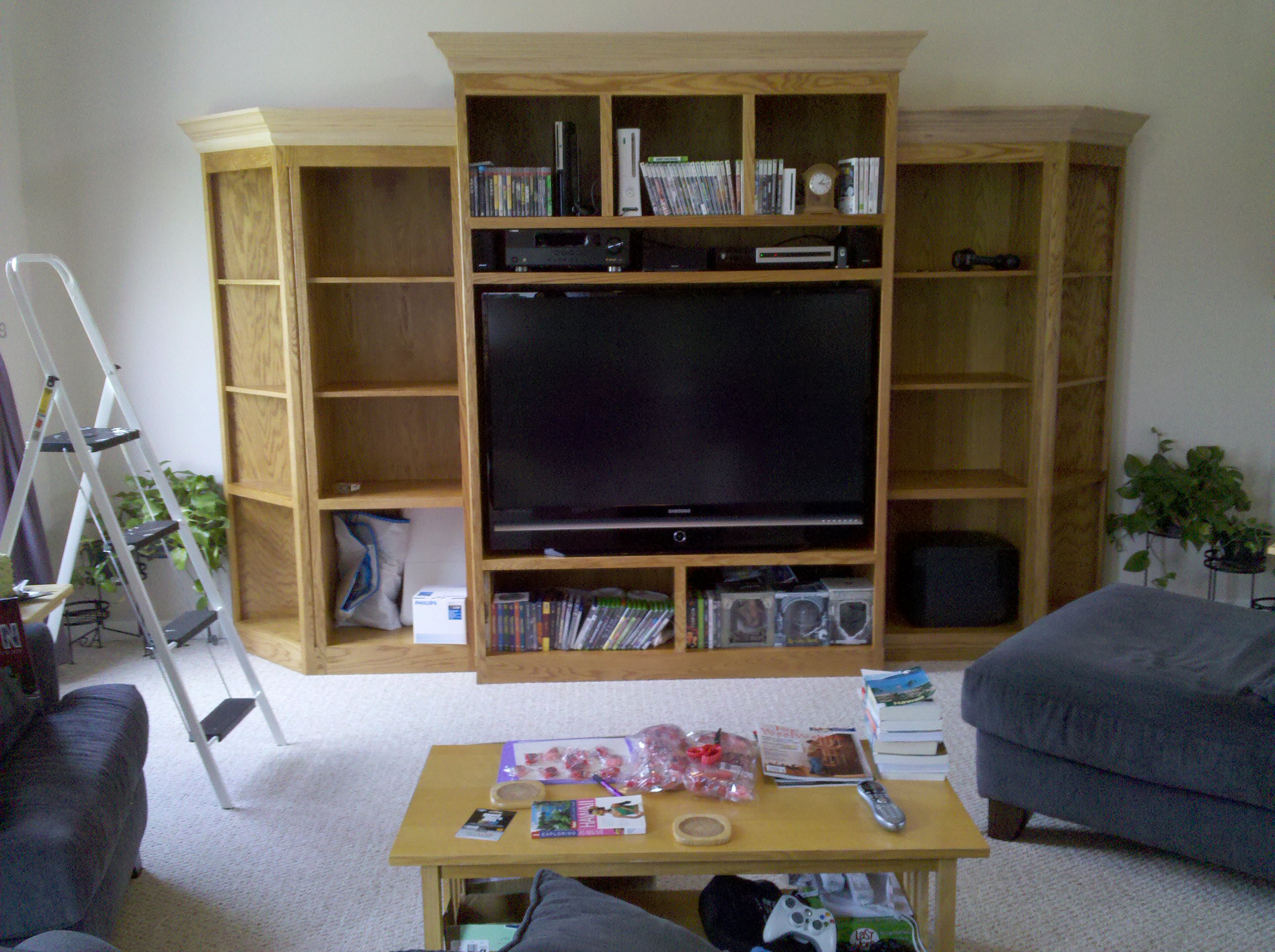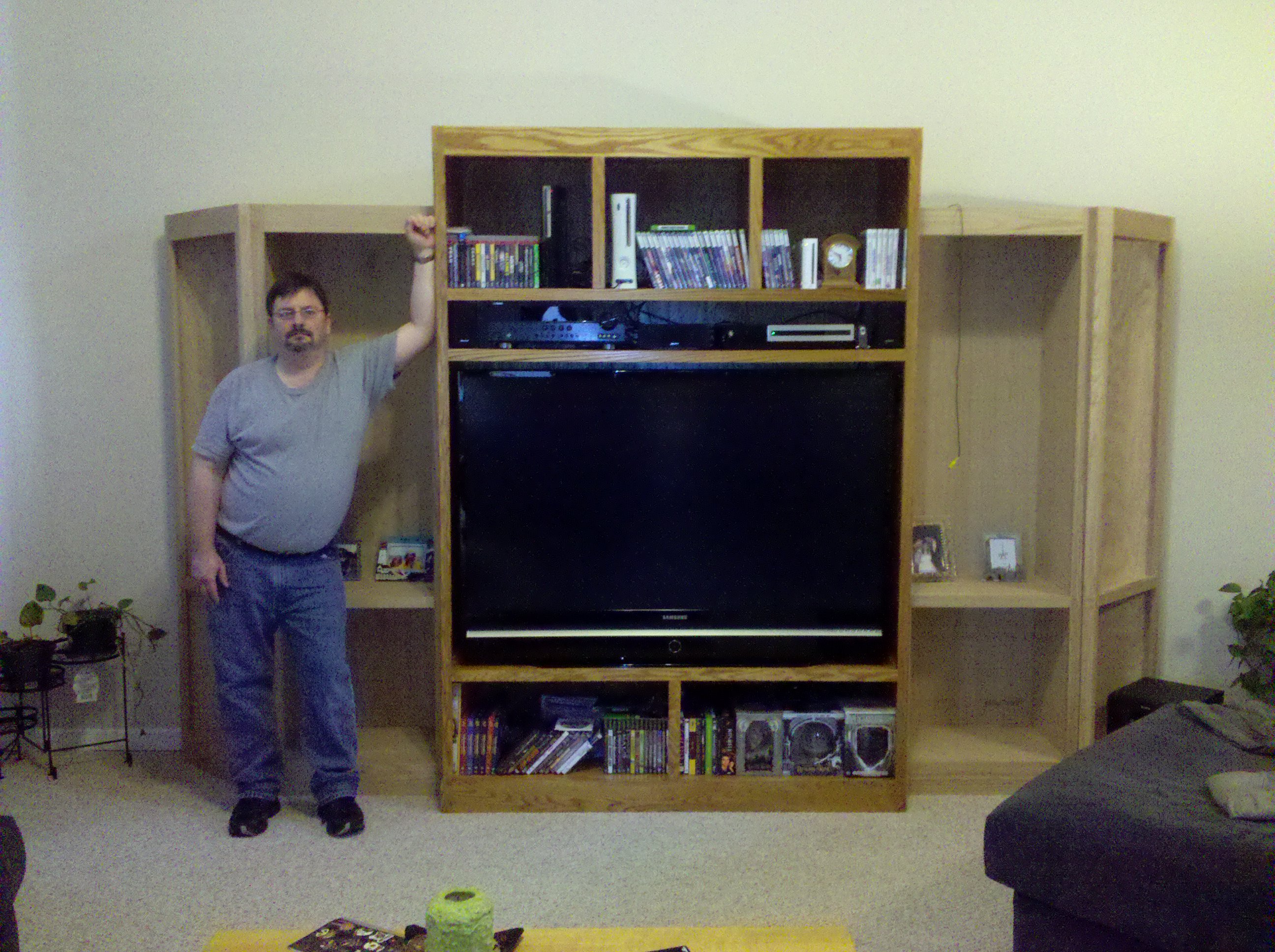 This is an entertainment center I made out of Oak and Oak plywood. It is about 11 feet wide and 8 feet tall. The opening is 5 feet wide made for a 61″ TV. I started it in early 2010 and finished all of the parts in 2013.