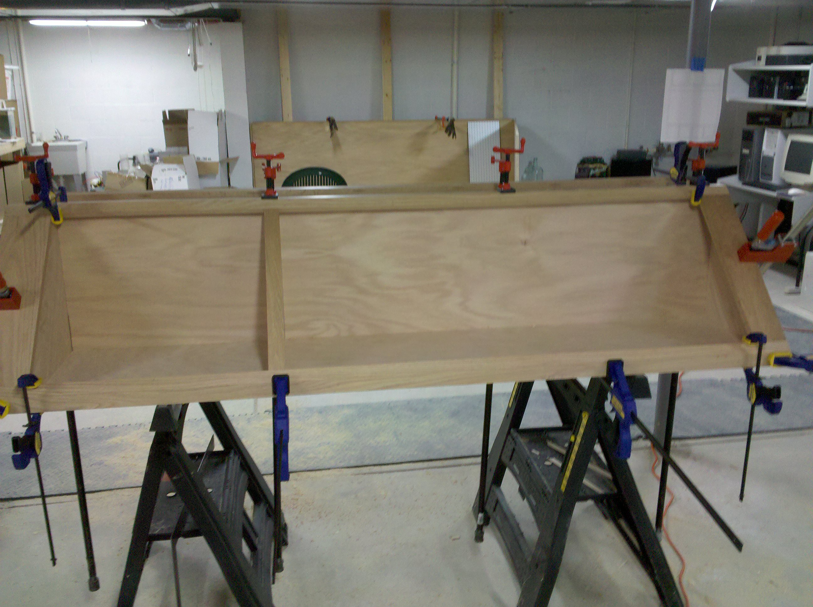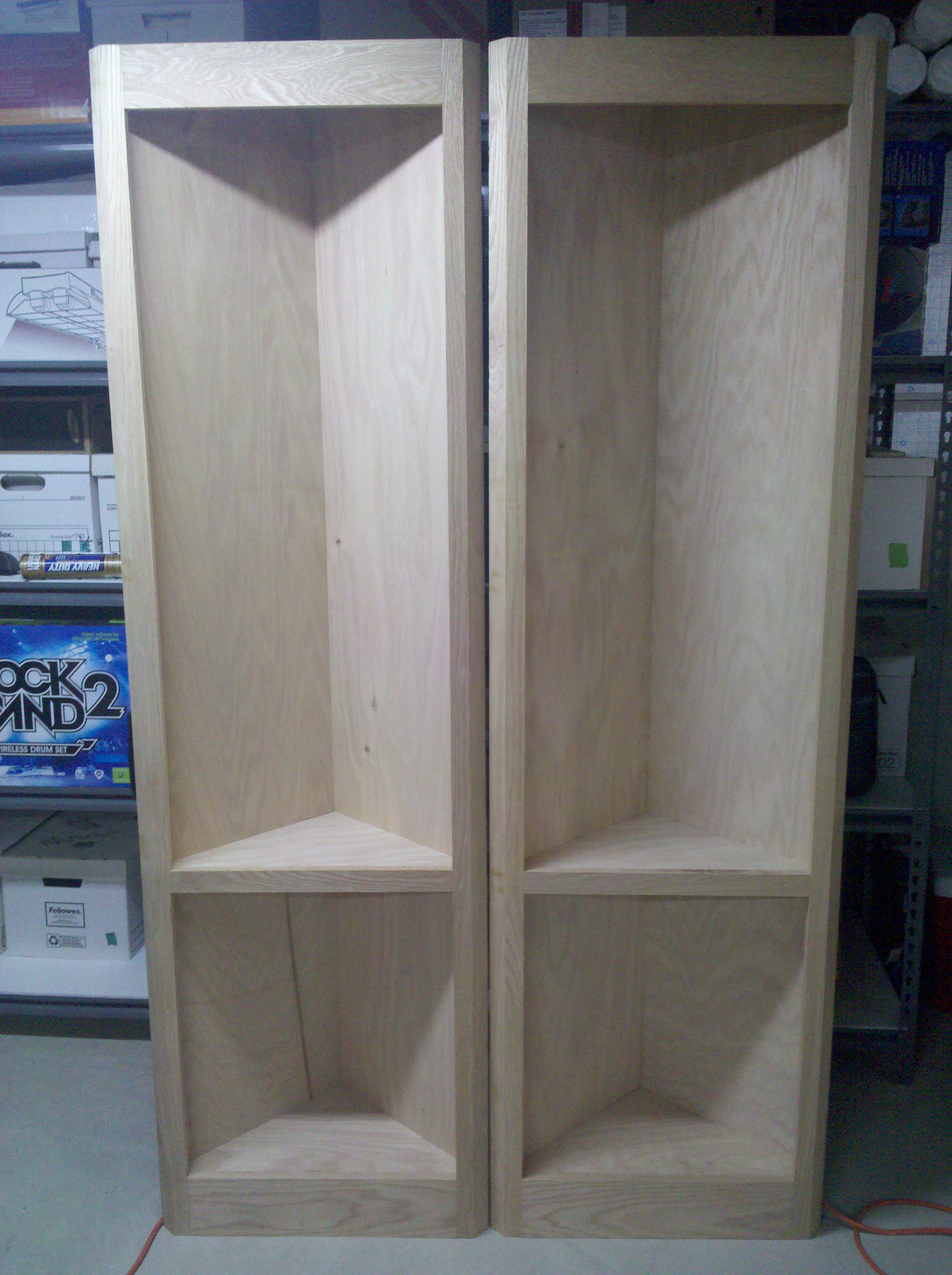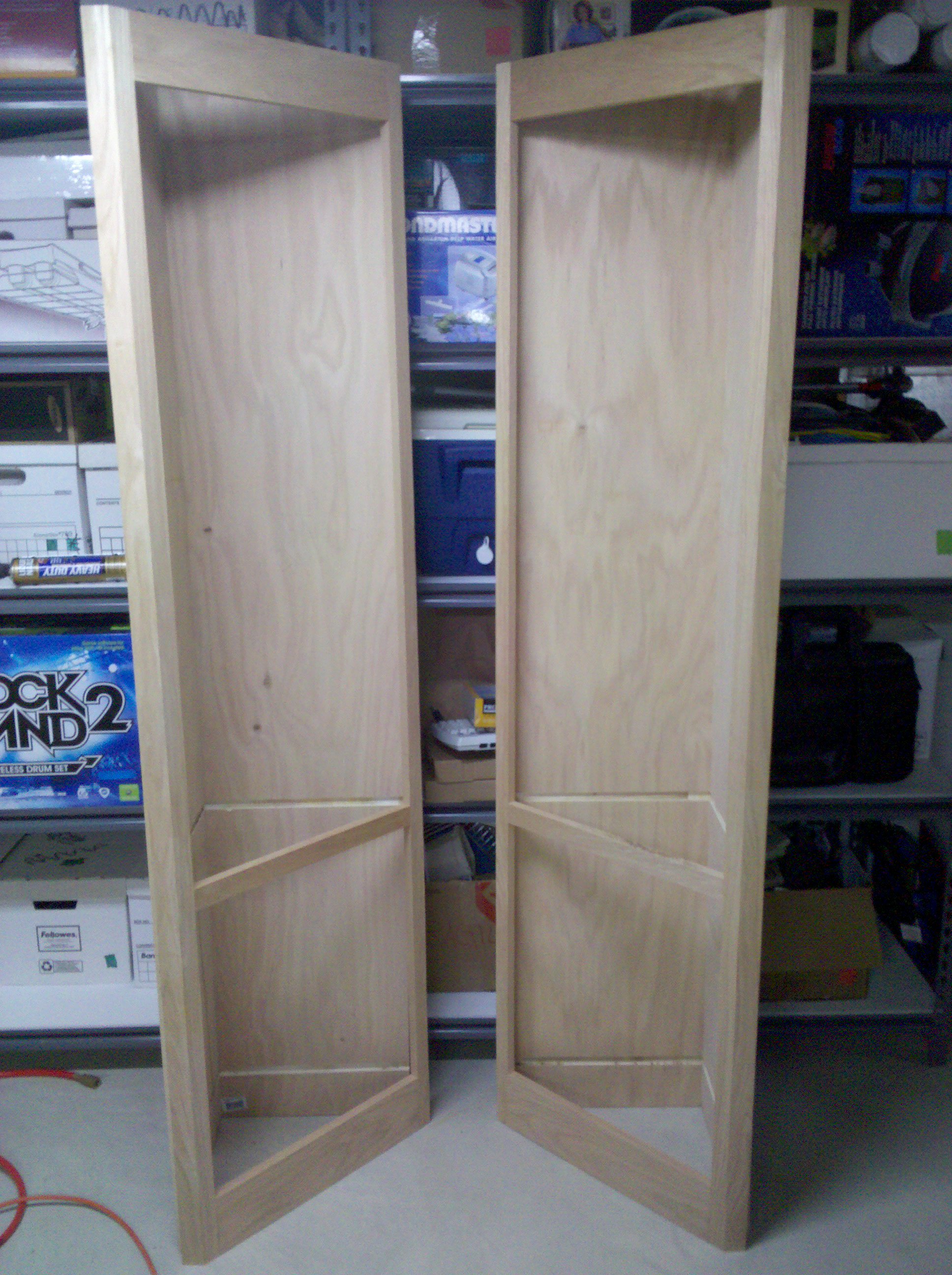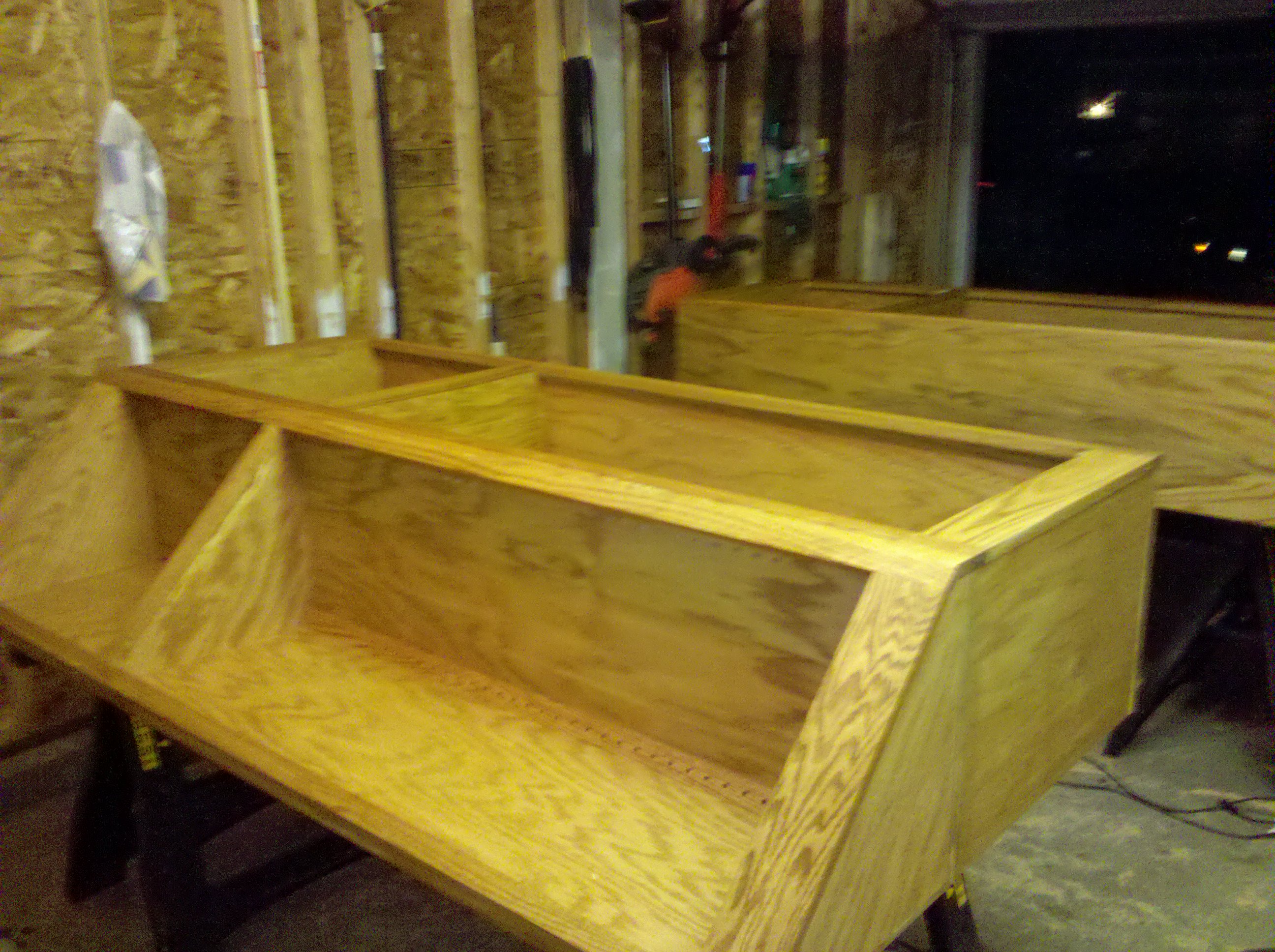 This is an entertainment center I made out of Oak and Oak plywood. It is about 11 feet wide and 8 feet tall. The opening is 5 feet wide made for a 61″ TV. I started it in early 2010 and finished all of the parts in 2013.