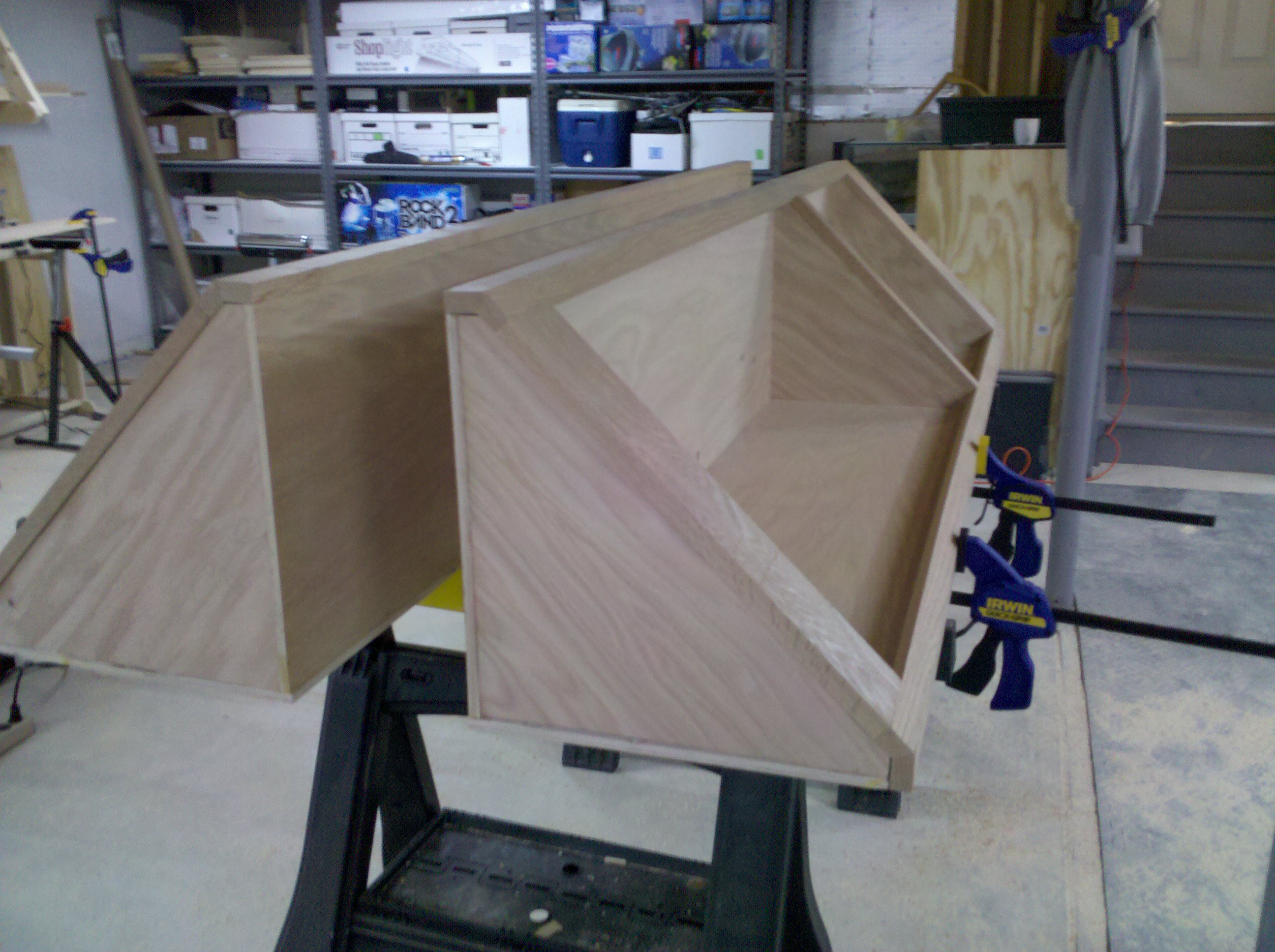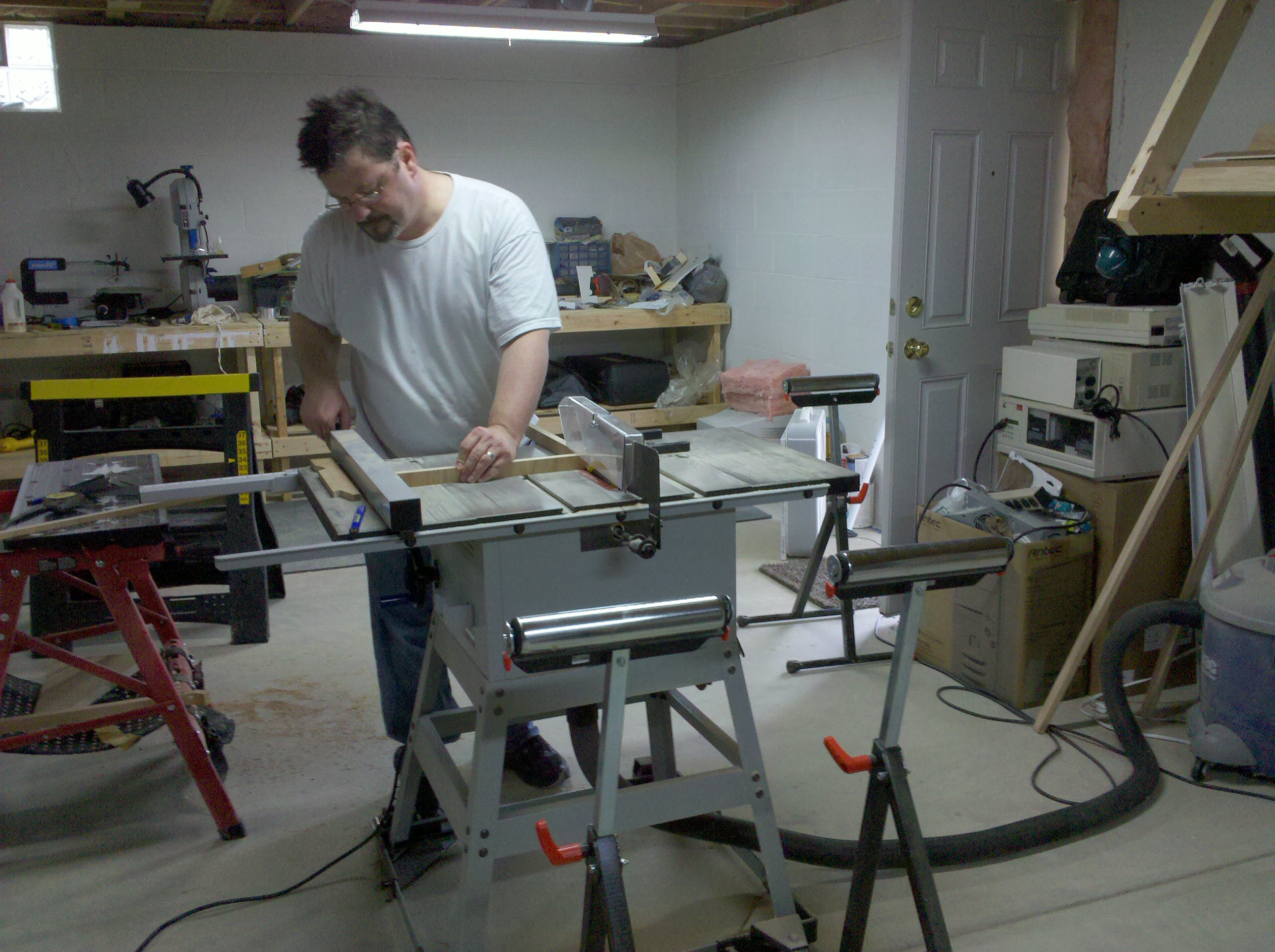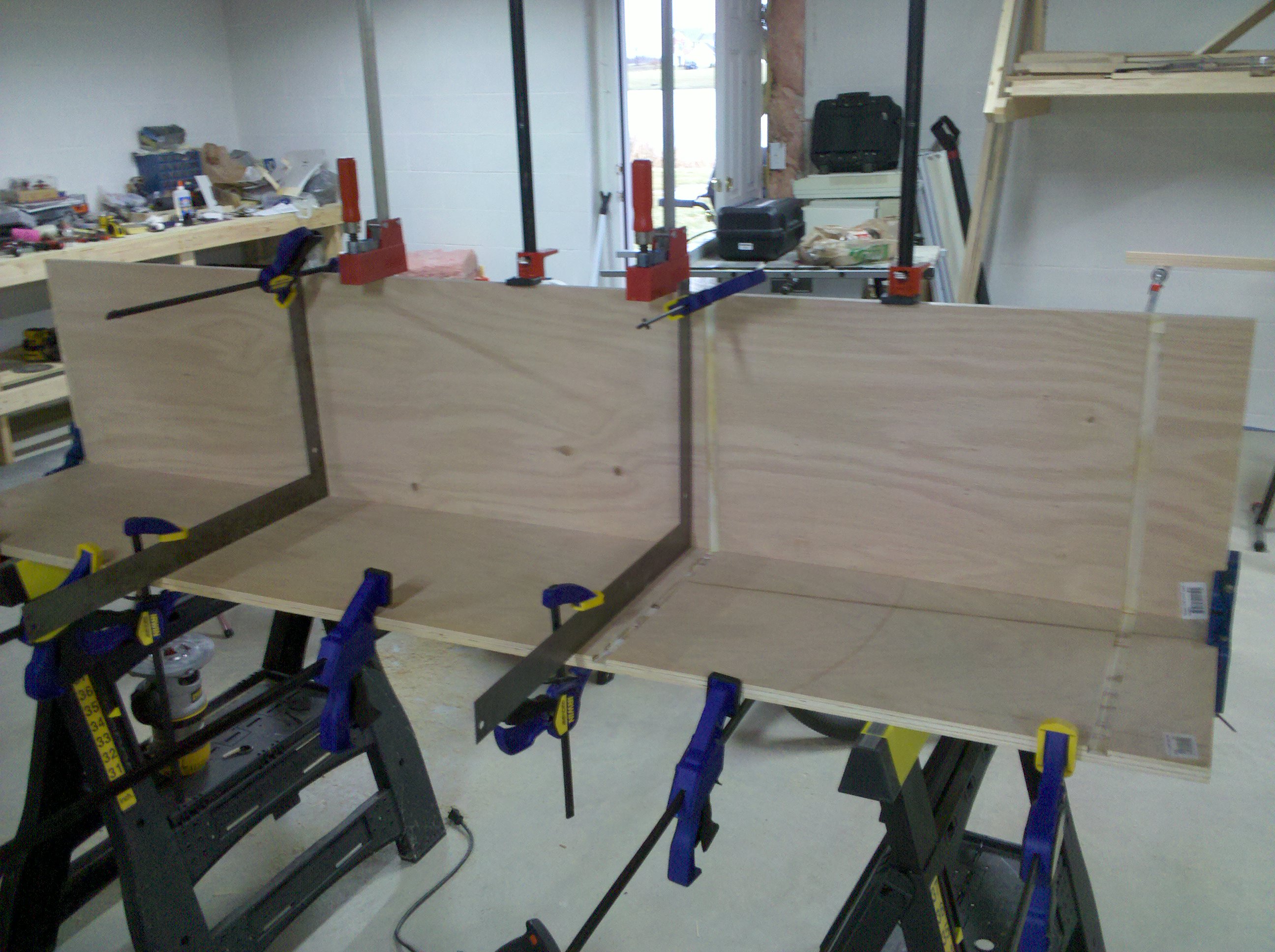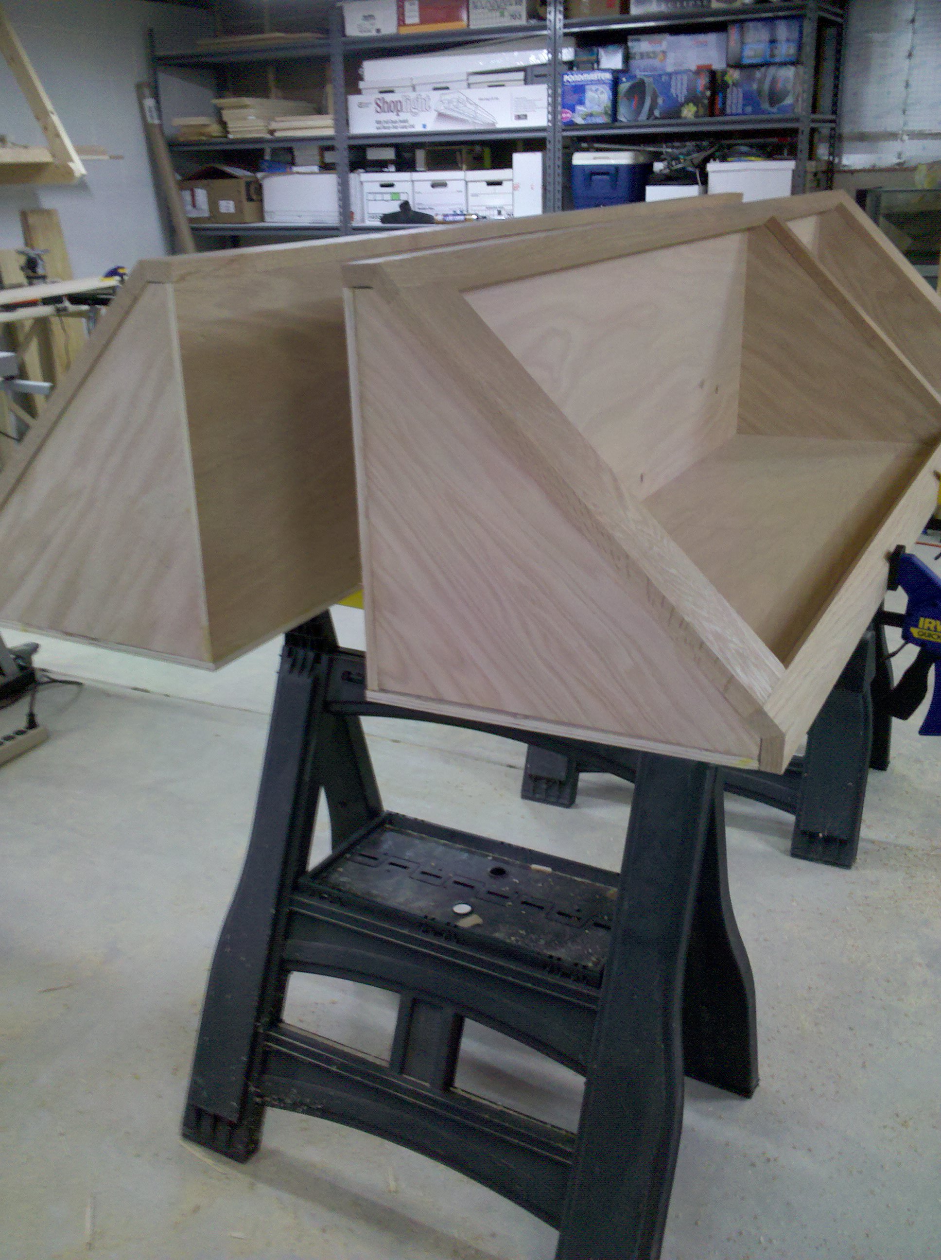 This is an entertainment center I made out of Oak and Oak plywood. It is about 11 feet wide and 8 feet tall. The opening is 5 feet wide made for a 61″ TV. I started it in early 2010 and finished all of the parts in 2013.