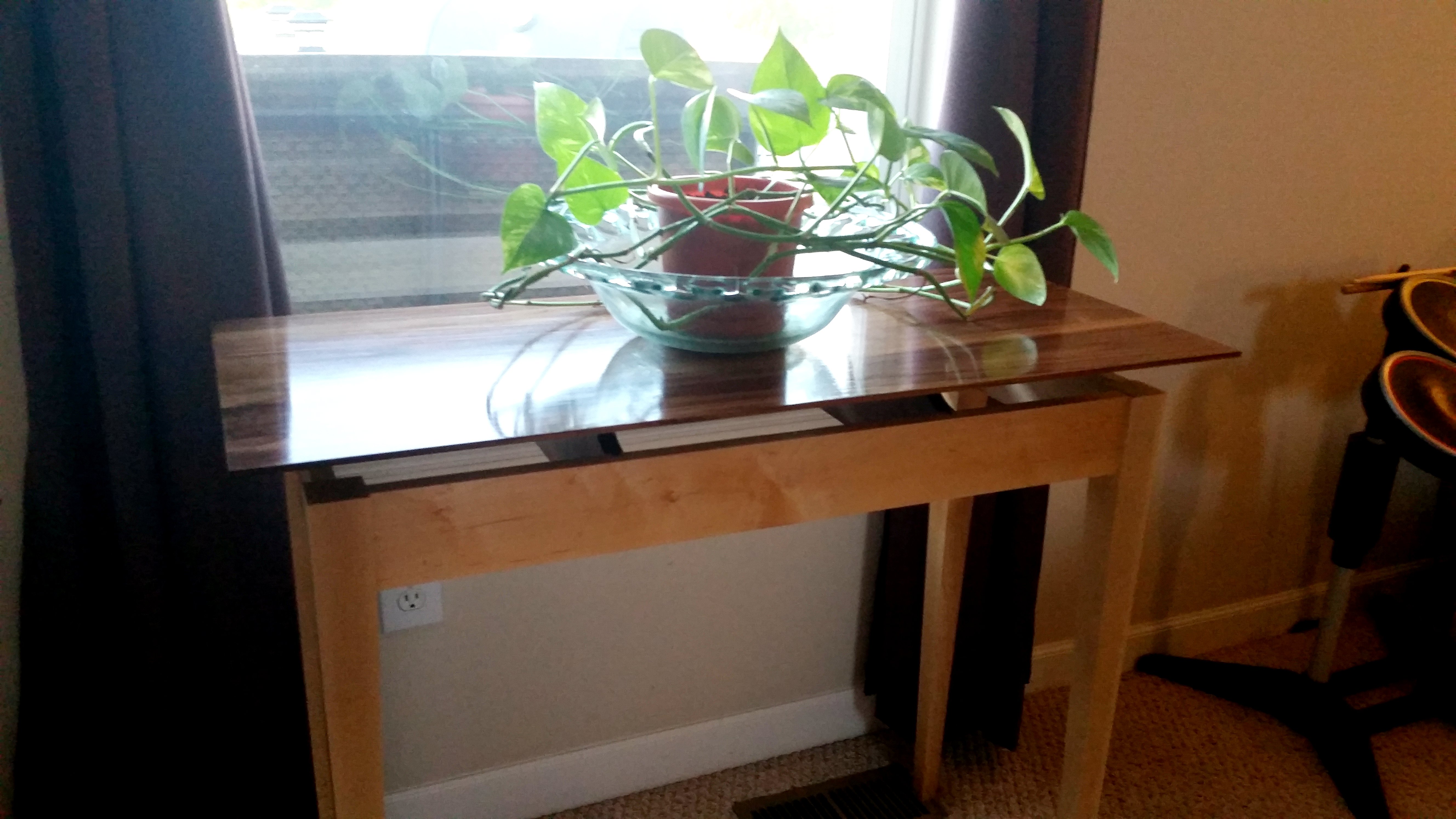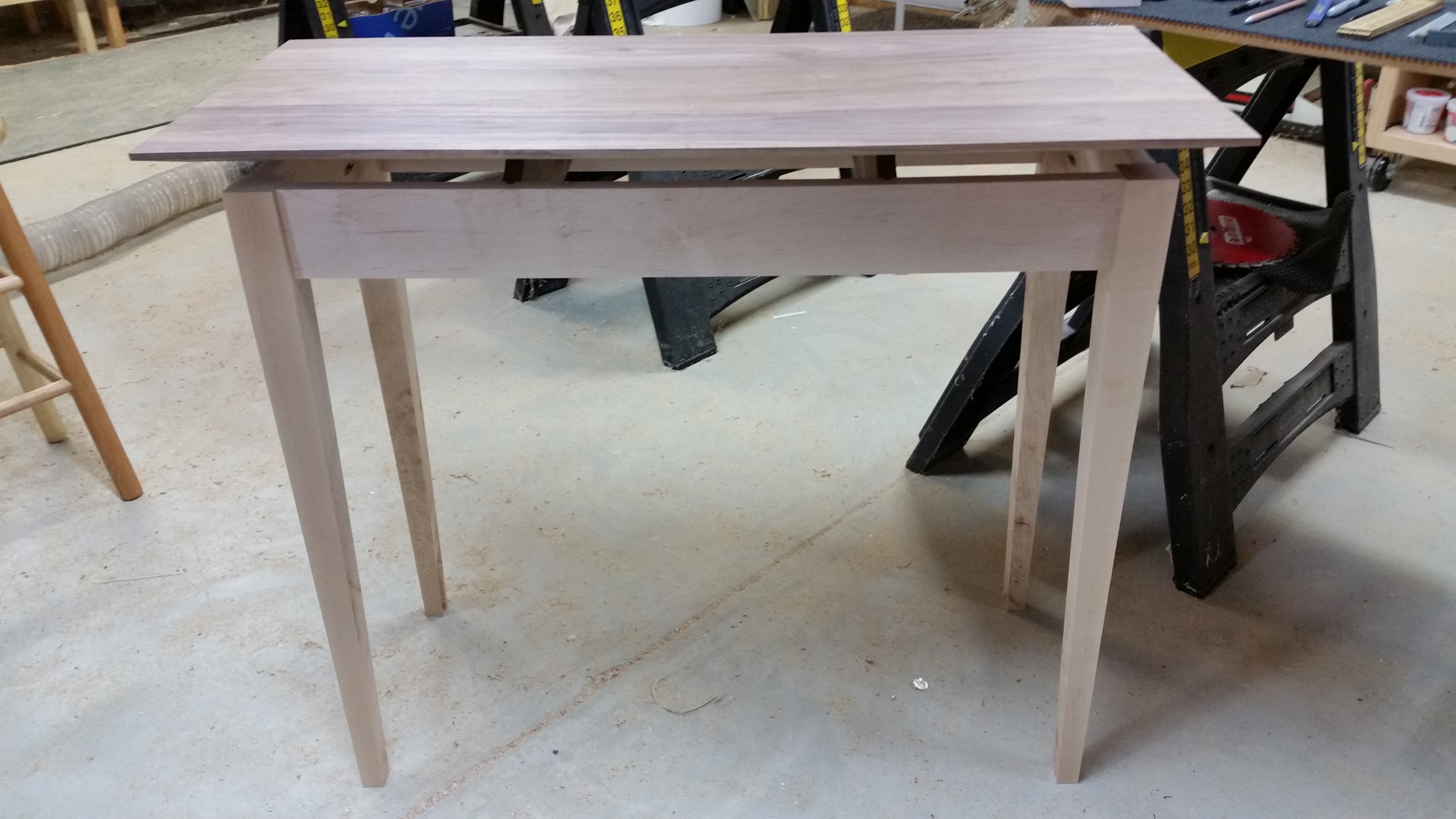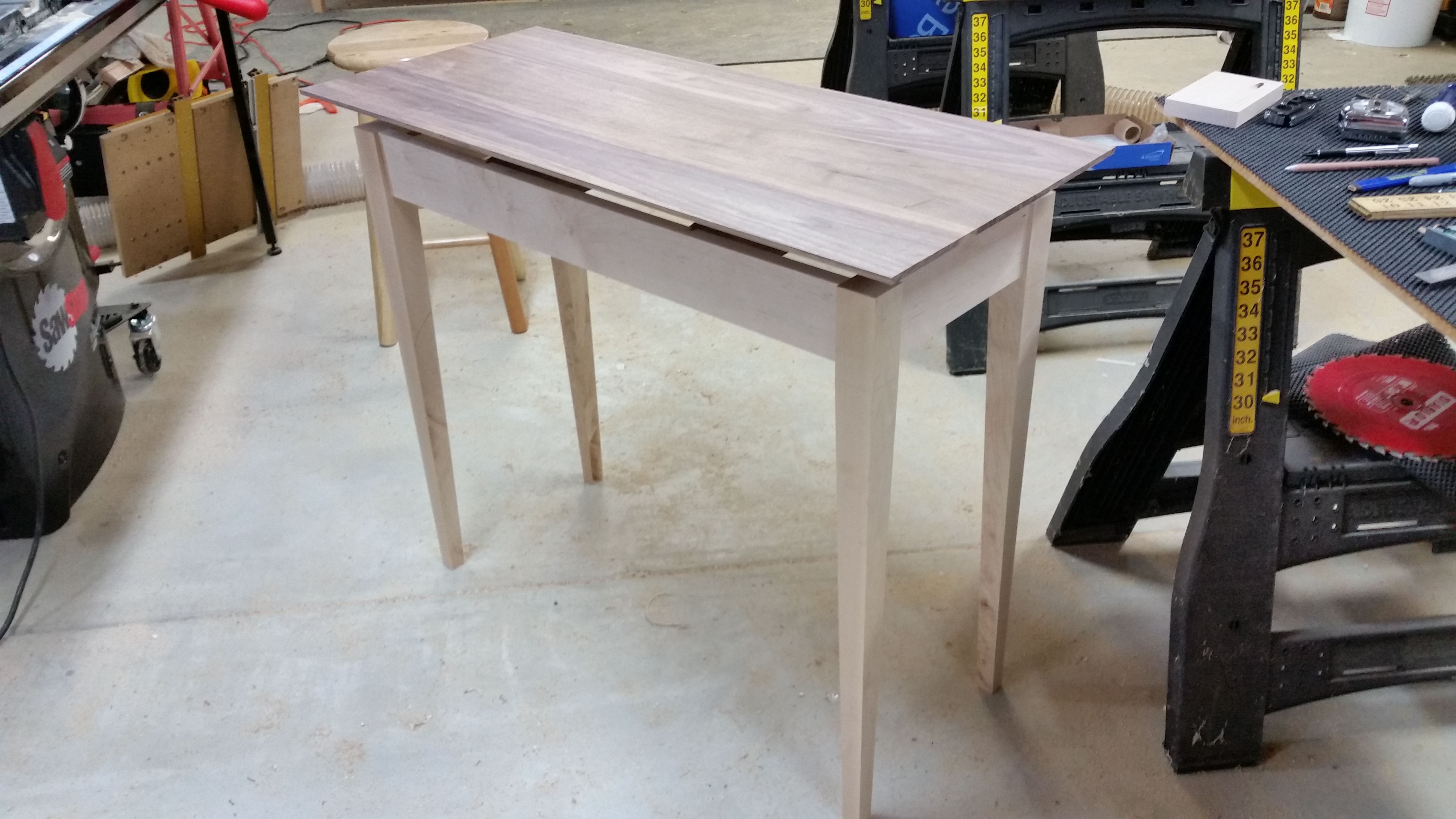 This is a Walnut top and Maple base console table I built in September 2015. It has a floating top that is lifted up from the side aprons with supports that are somewhat hidden providing a floating effect. The top is finished with 25+ coats of shellac in a French polish type method.