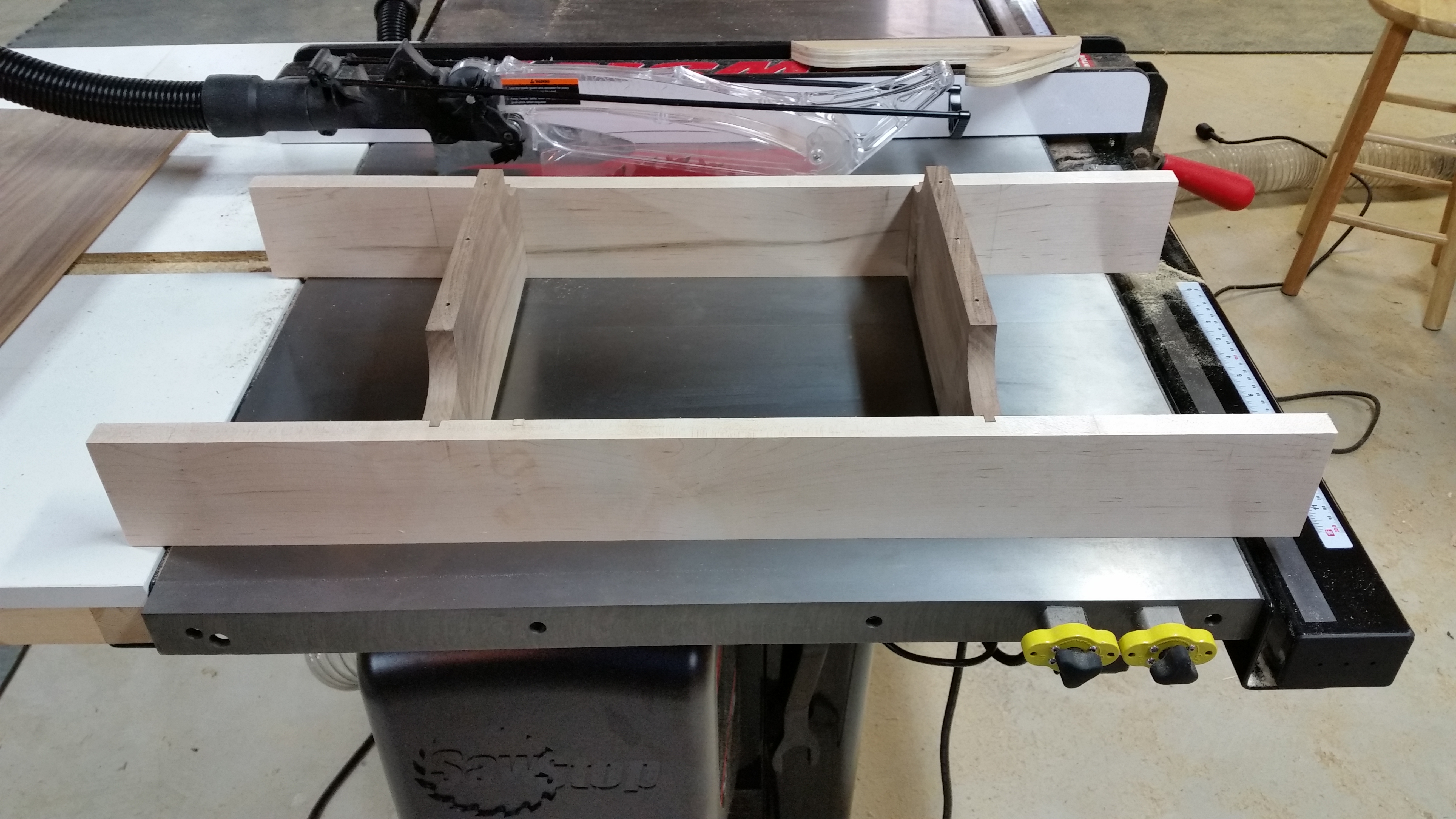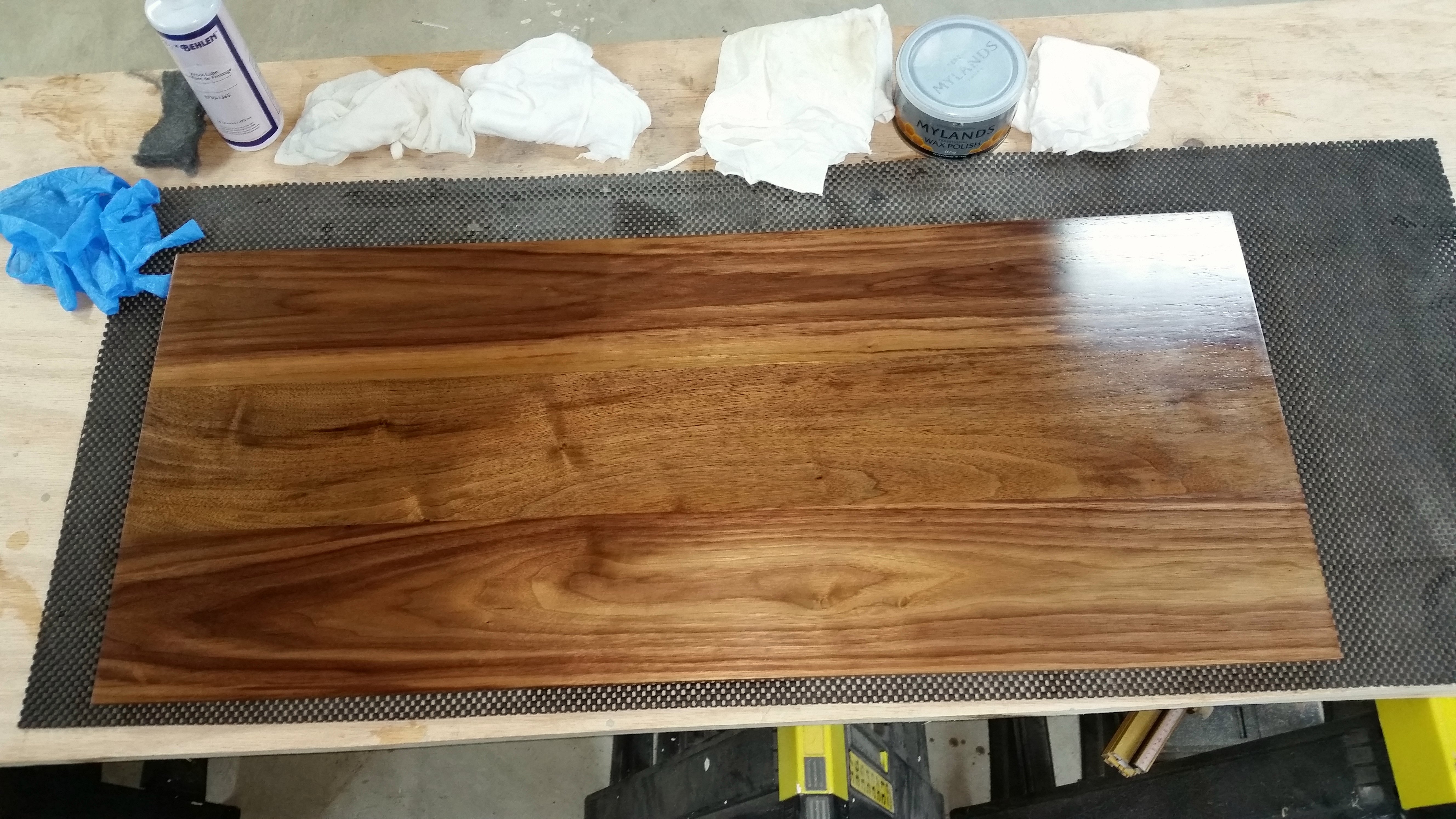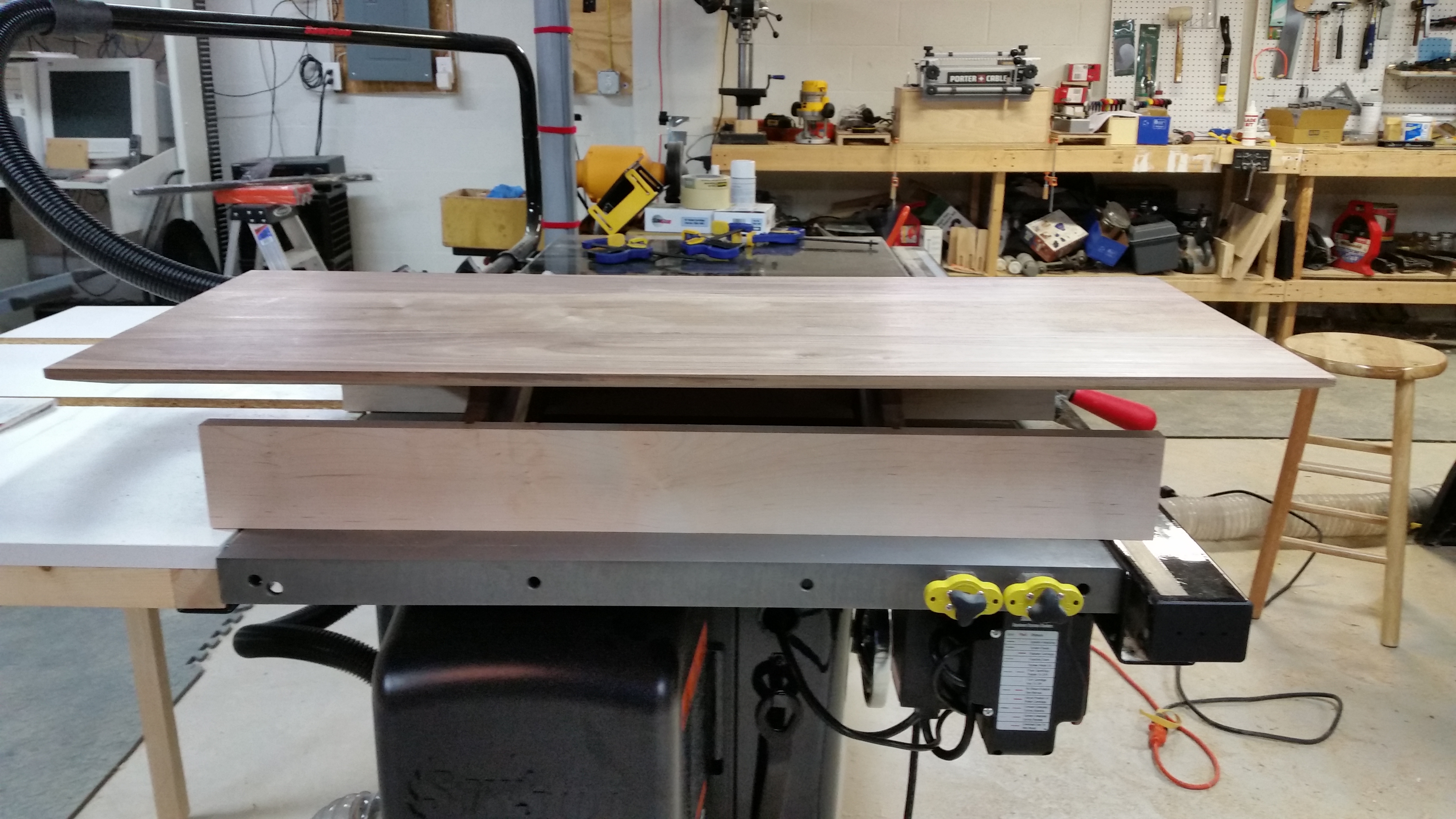 This is a Walnut top and Maple base console table I built in September 2015. It has a floating top that is lifted up from the side aprons with supports that are somewhat hidden providing a floating effect. The top is finished with 25+ coats of shellac in a French polish type method.