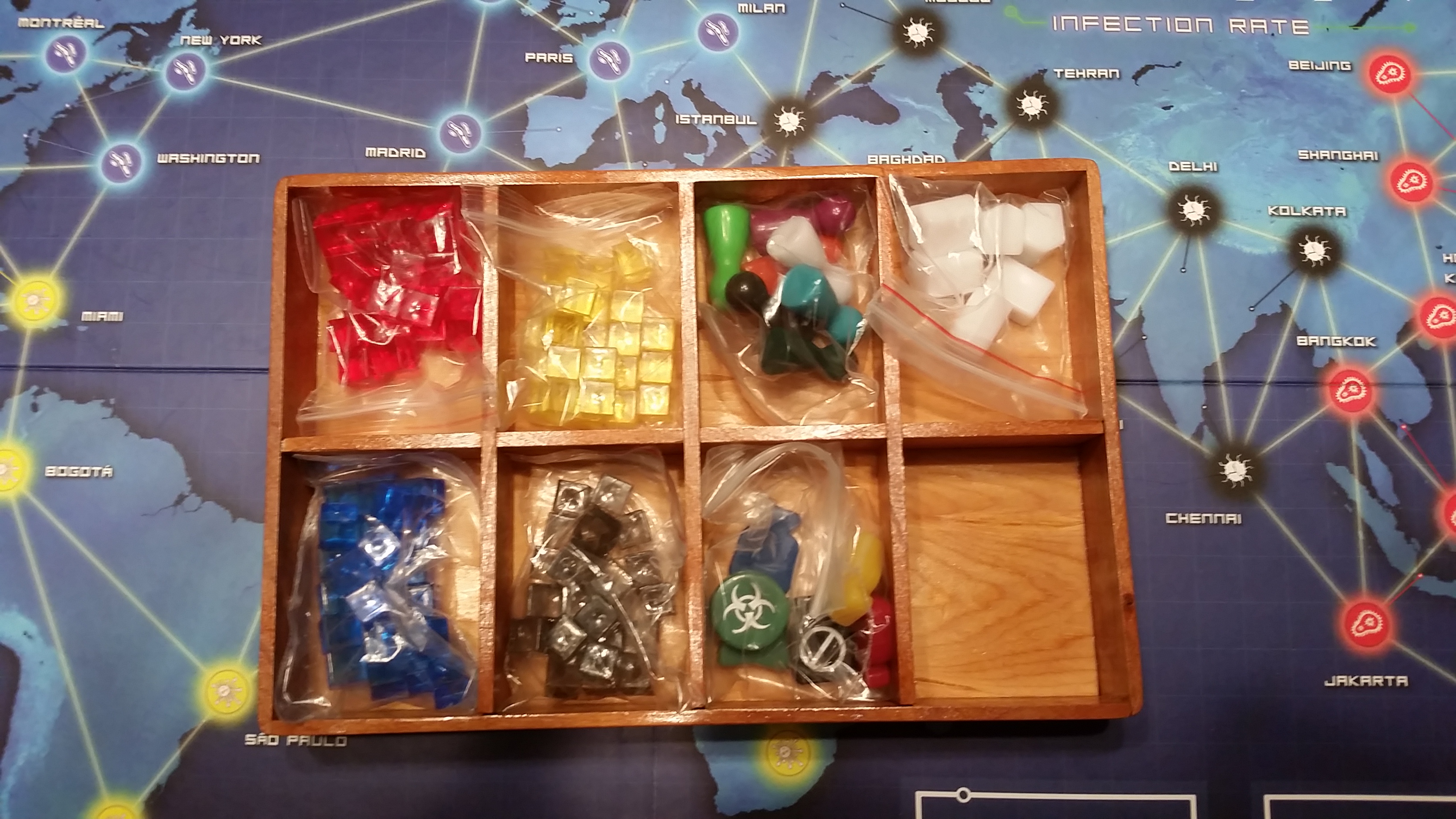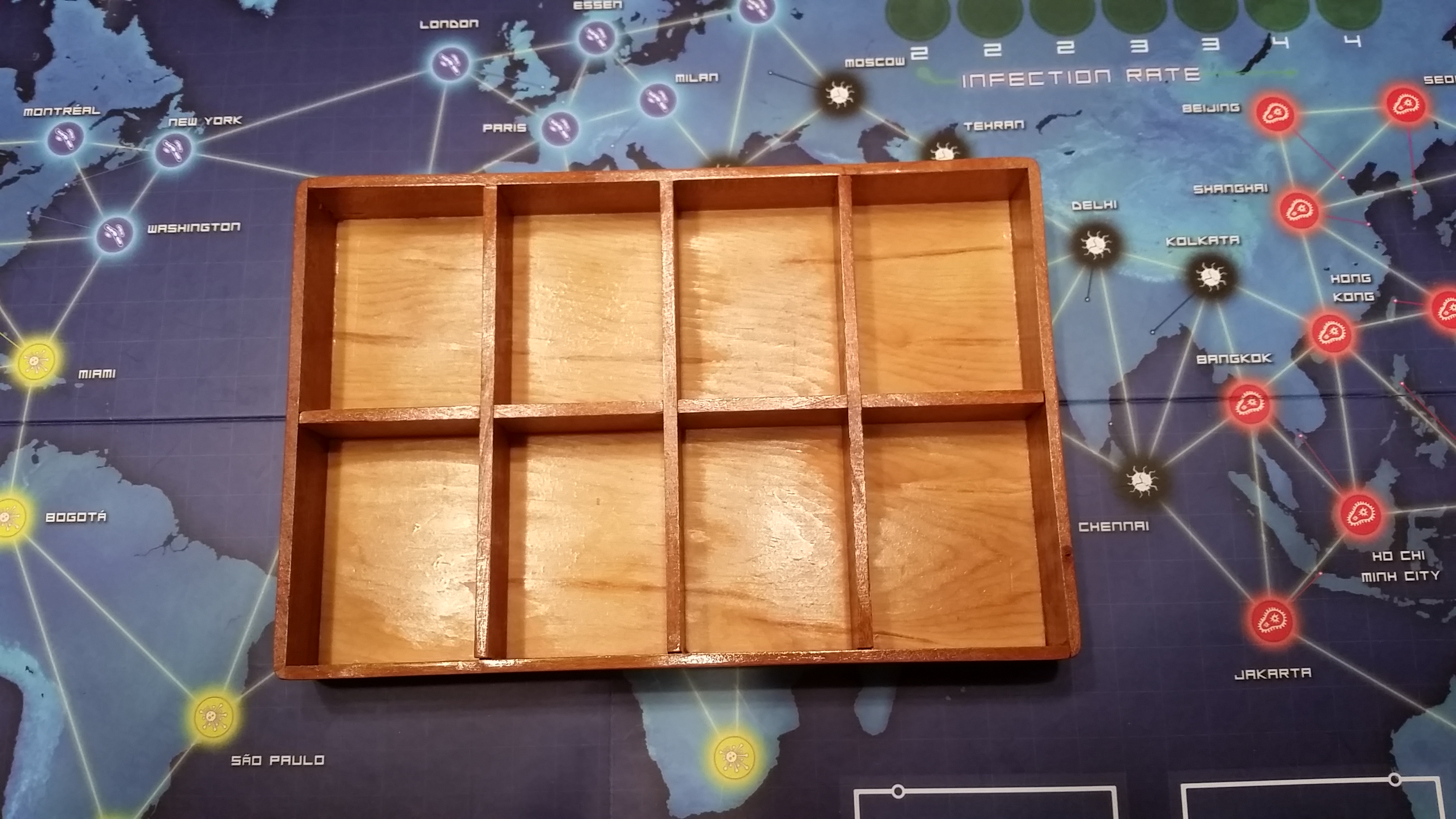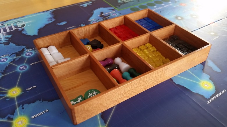 This is a little game piece holder I made in February of 2015. It is made from Cherry and finished with Waterlox. The game I made it for is called Pandemic, a co-operative game about stopping a worldwide pandemic.