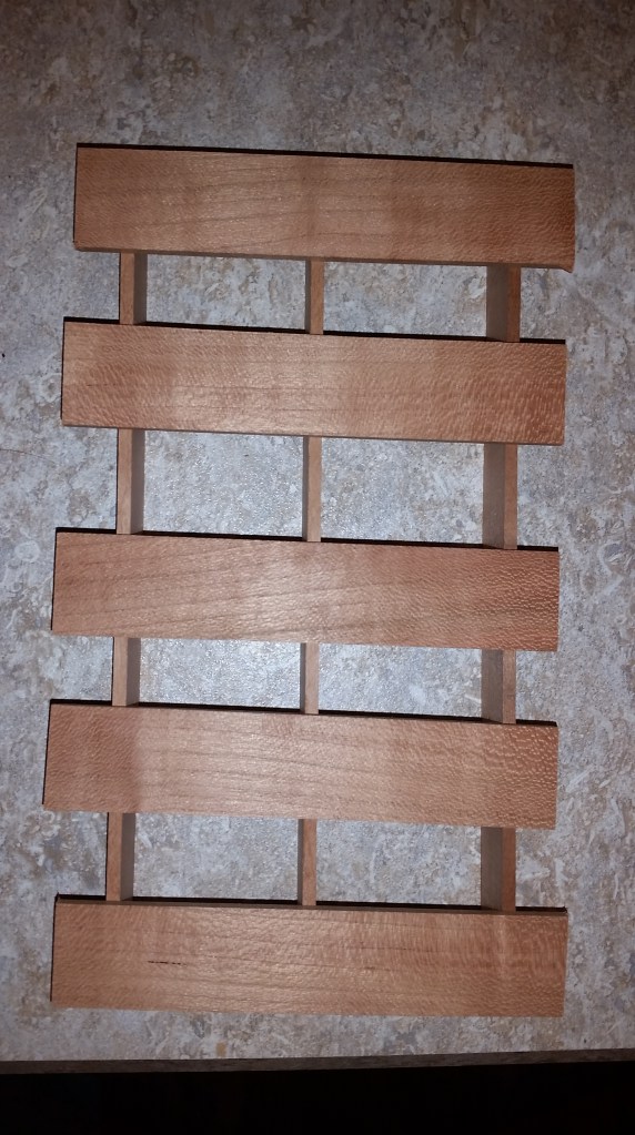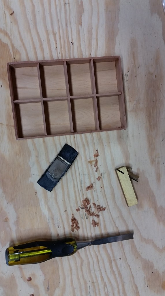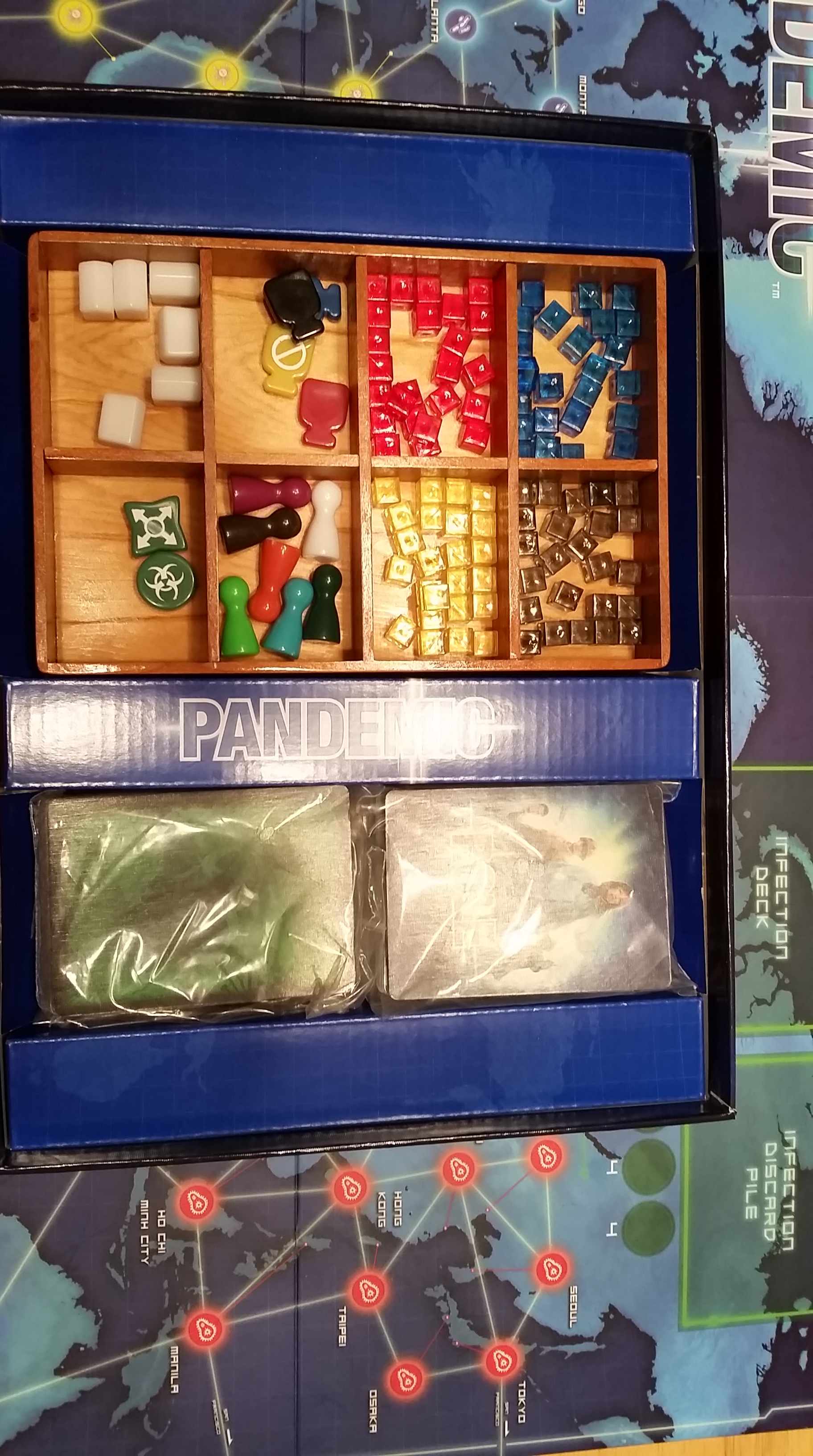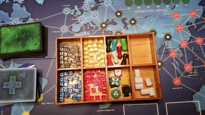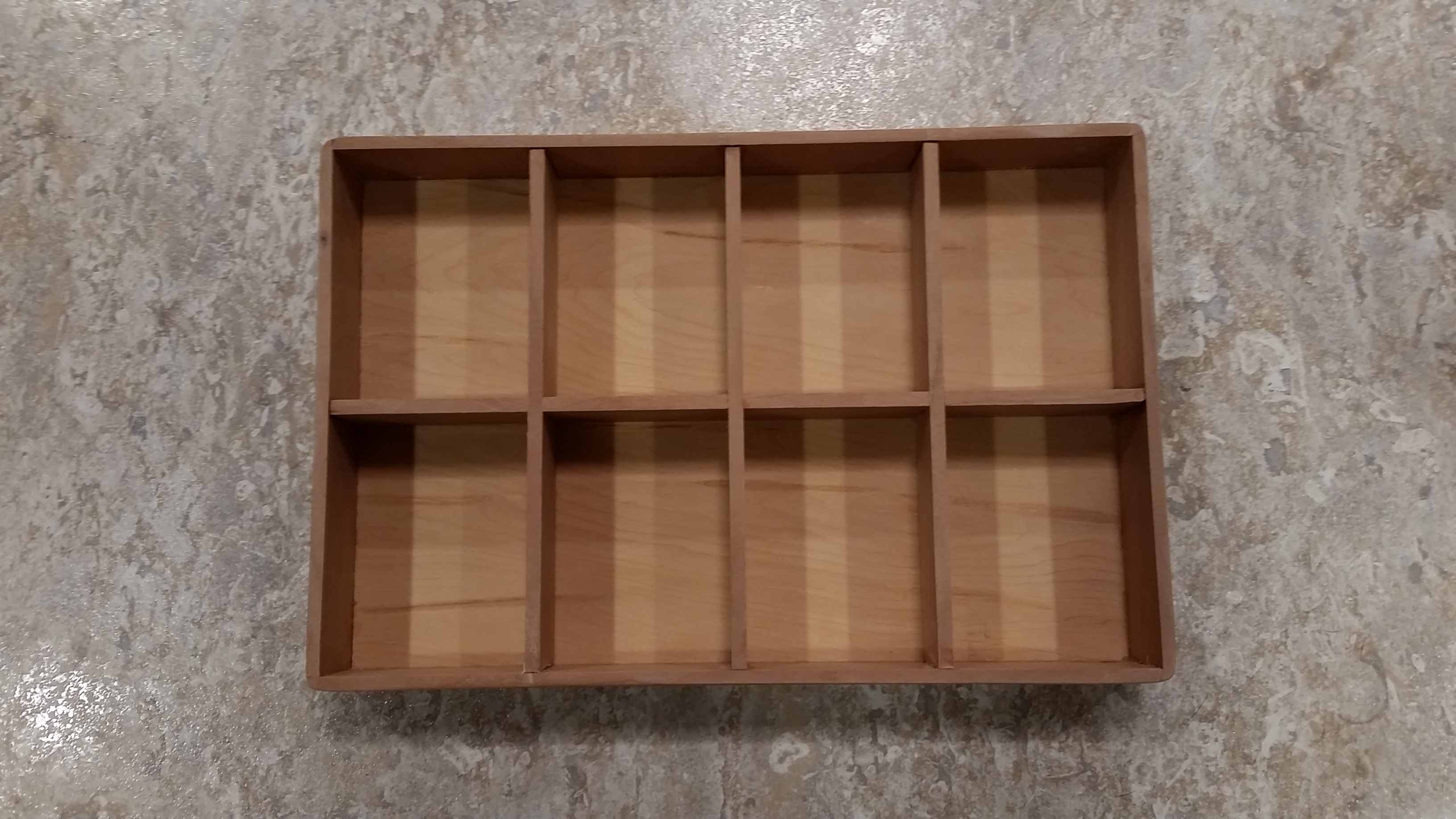 This is a little game piece holder I made in February of 2015. It is made from Cherry and finished with Waterlox. The game I made it for is called Pandemic, a co-operative game about stopping a worldwide pandemic.