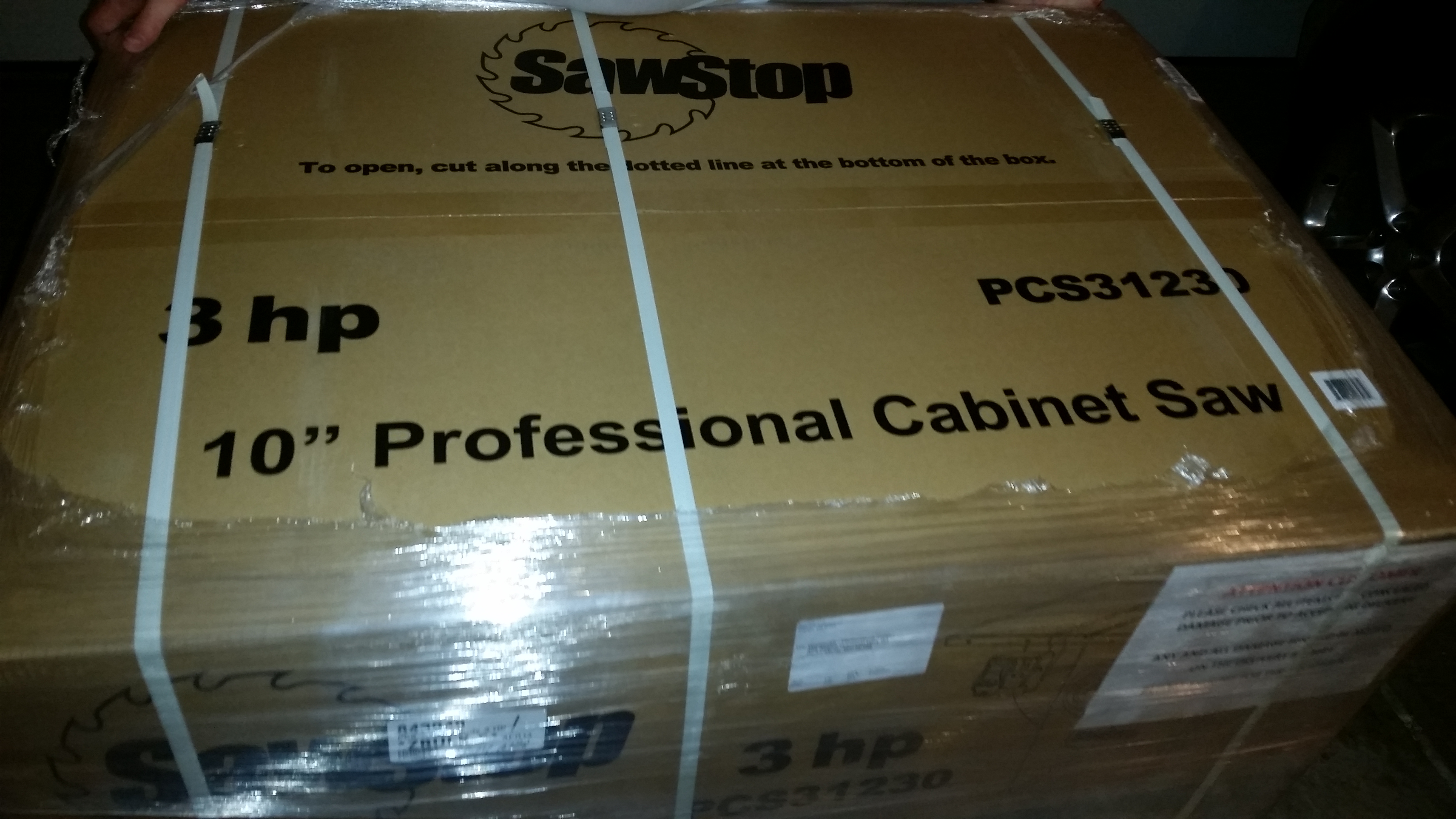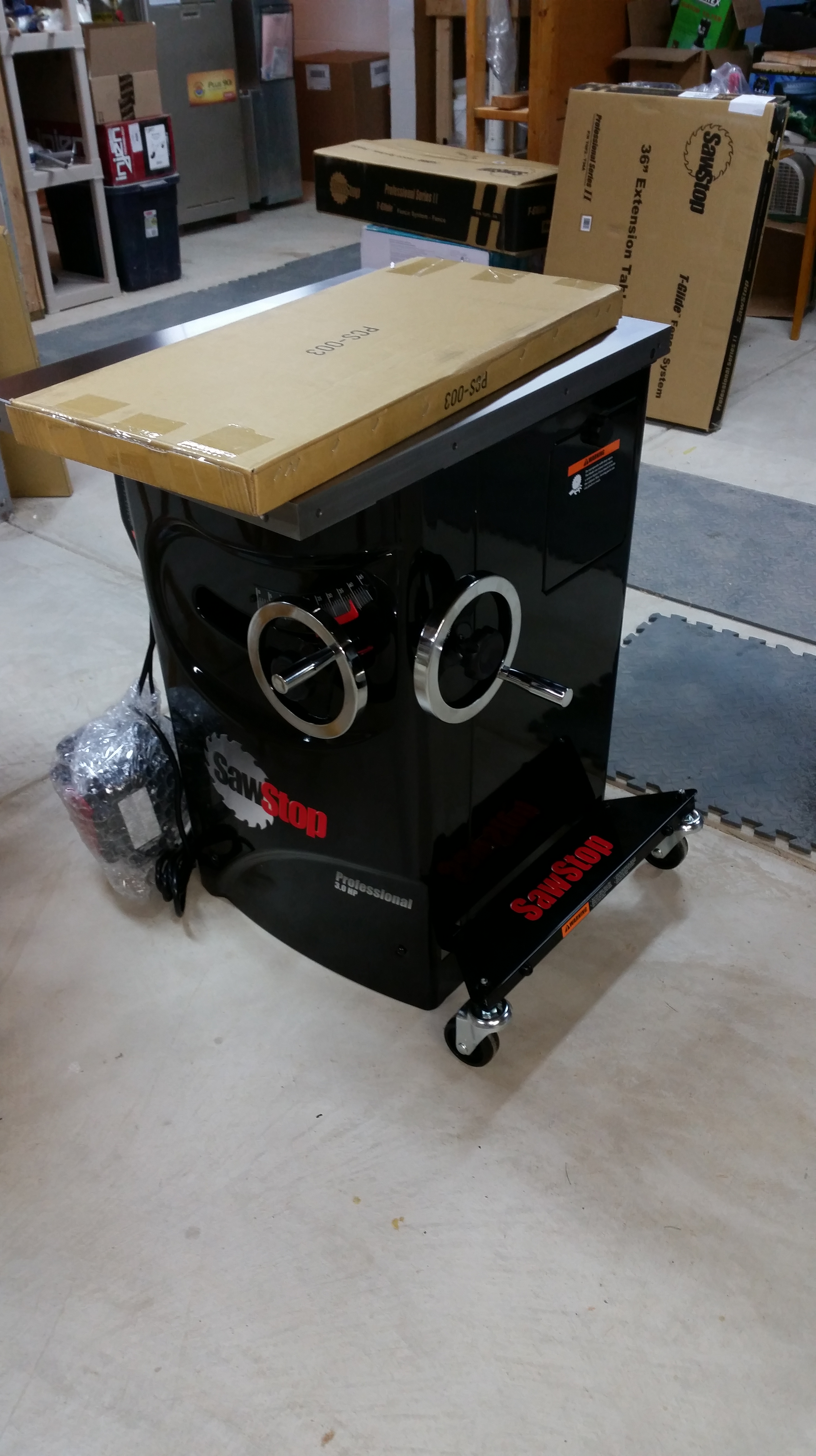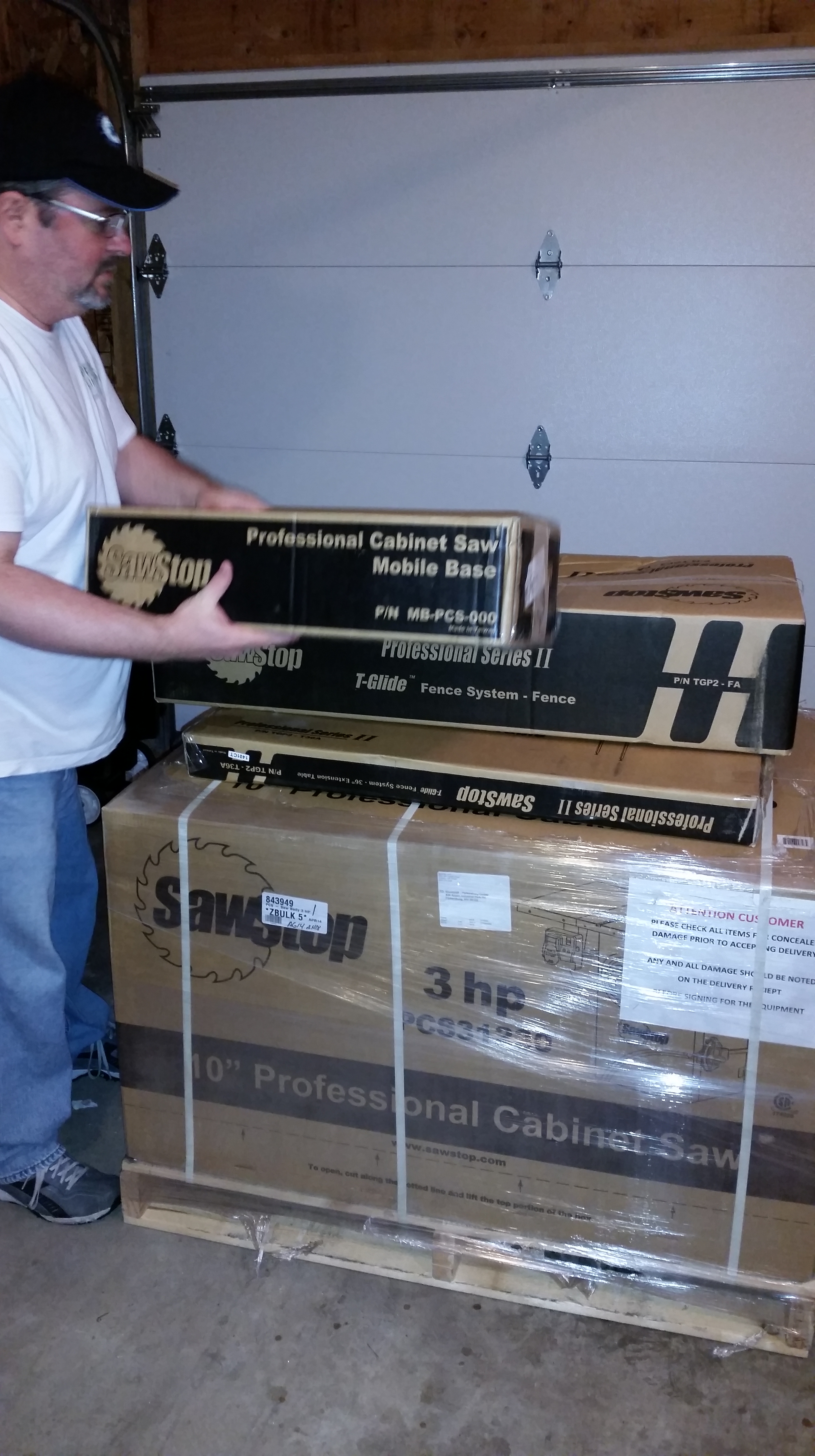 Here is my new Sawstop 3hp PCS table saw in April of 2014. I had to hire piano movers to move it from my garage to my walkout basement. It was on a pallet and weighed over 500lbs. Once it was in the basement the unpacking and setup was very easy and I only required help once when I stood it up. Sawstop did a great job on the packing and setup procedure and it only took about five hours to unpack, setup, and have it ready for use. Even though this was the most expensive single tool I have ever purchased, it is the one that I am the most pleased with. It is a central part of my shop and is used in every project I make.