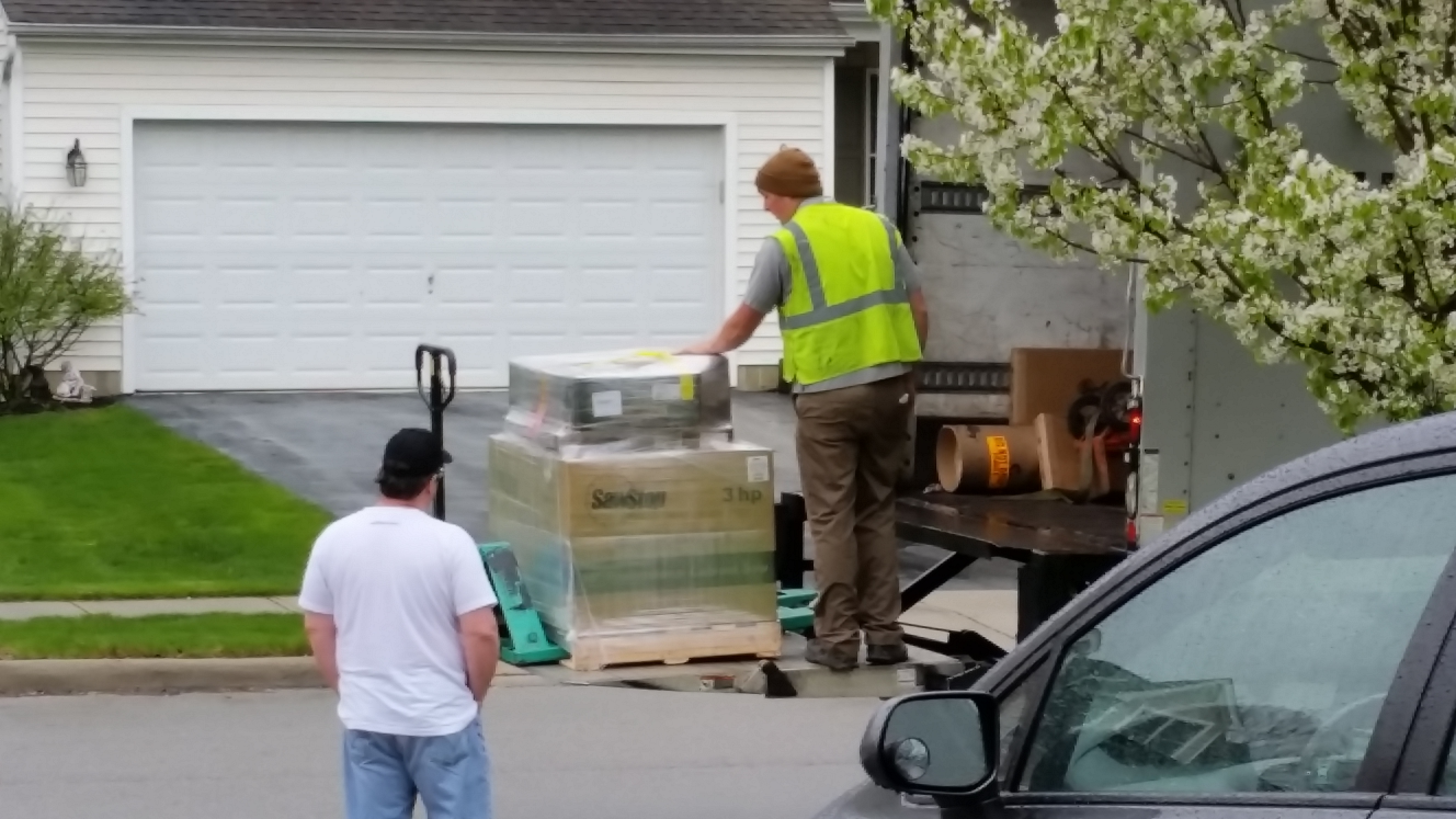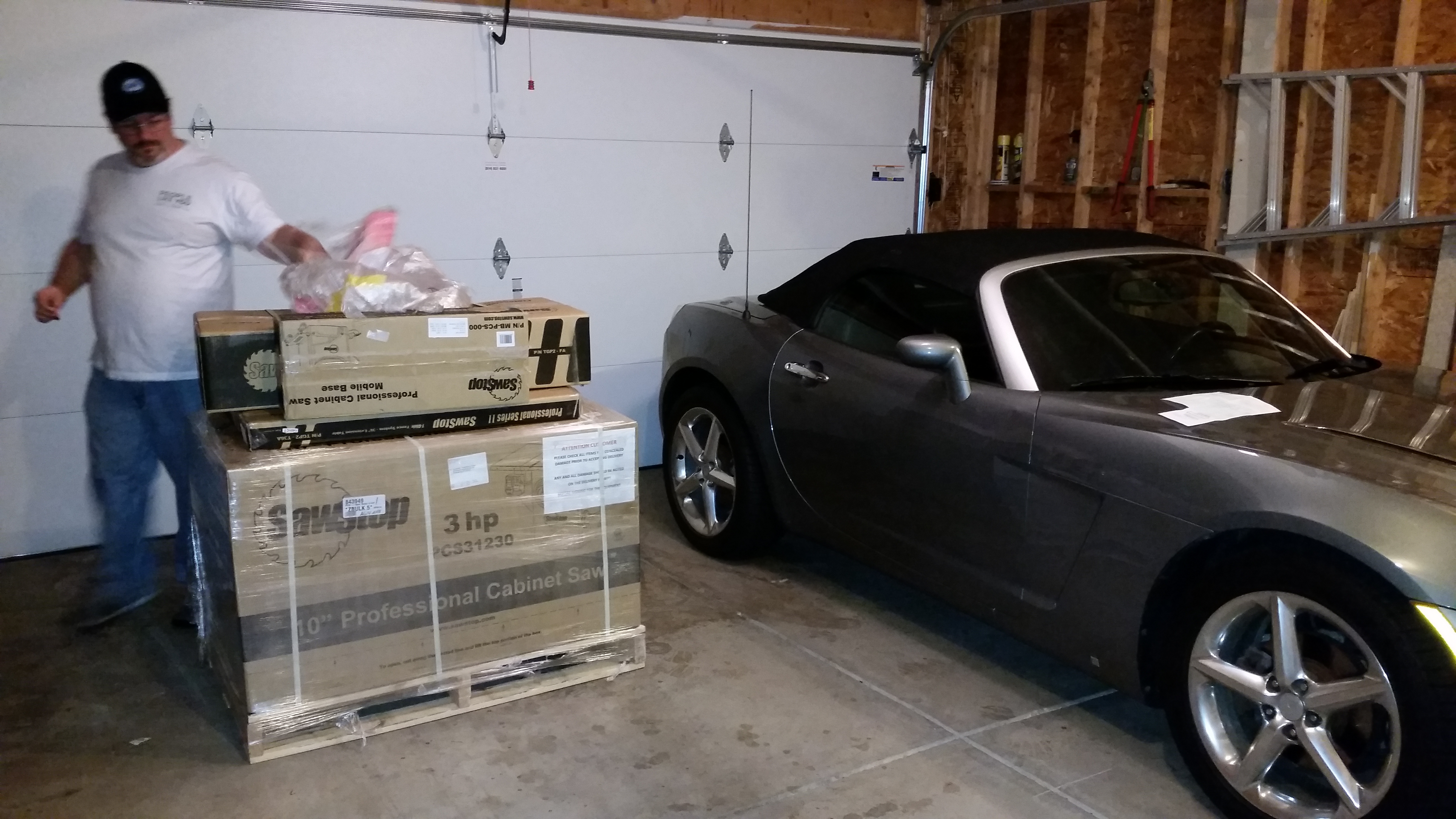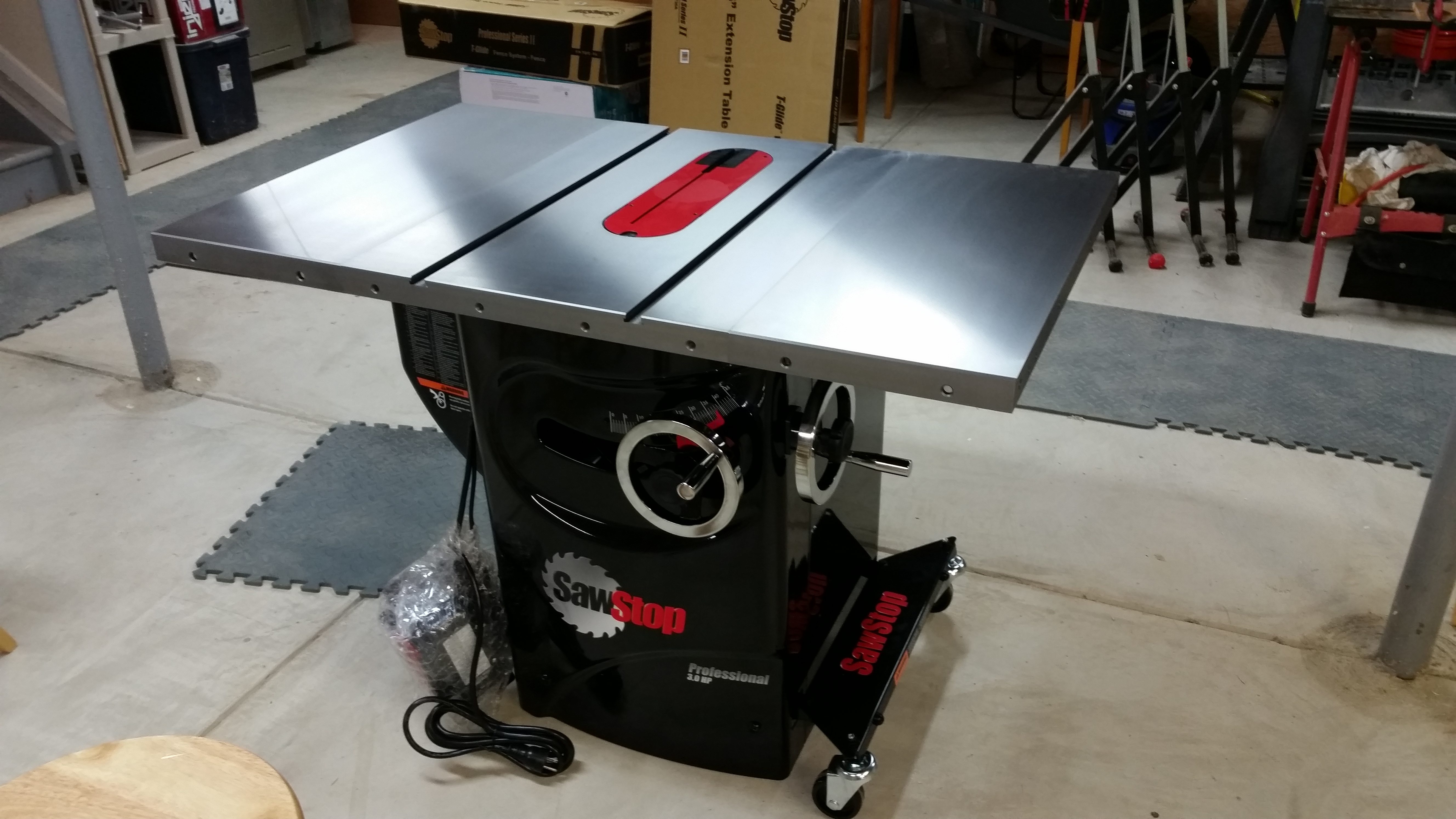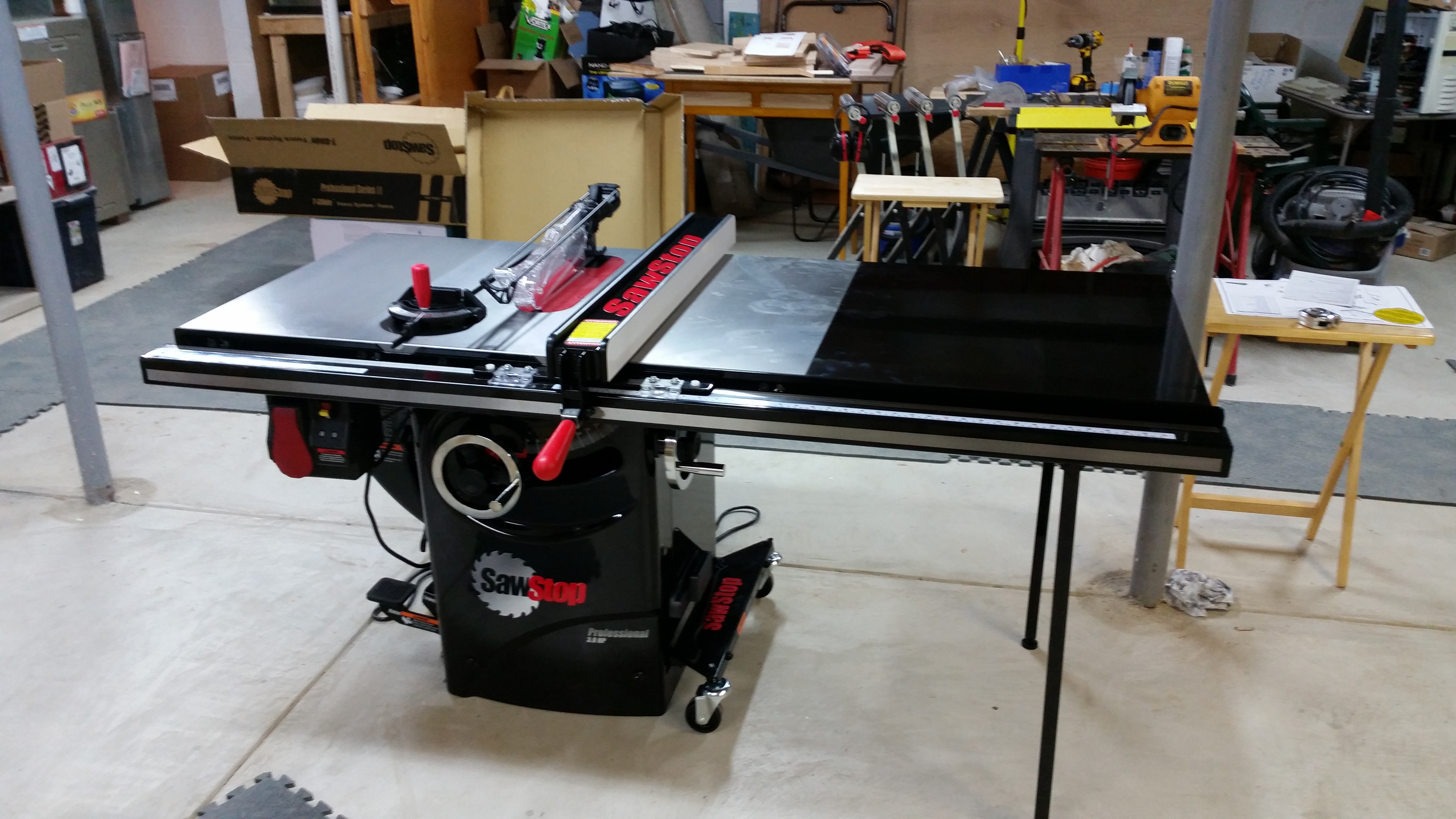 Here is my new Sawstop 3hp PCS table saw in April of 2014. I had to hire piano movers to move it from my garage to my walkout basement. It was on a pallet and weighed over 500lbs. Once it was in the basement the unpacking and setup was very easy and I only required help once when I stood it up. Sawstop did a great job on the packing and setup procedure and it only took about five hours to unpack, setup, and have it ready for use. Even though this was the most expensive single tool I have ever purchased, it is the one that I am the most pleased with. It is a central part of my shop and is used in every project I make.