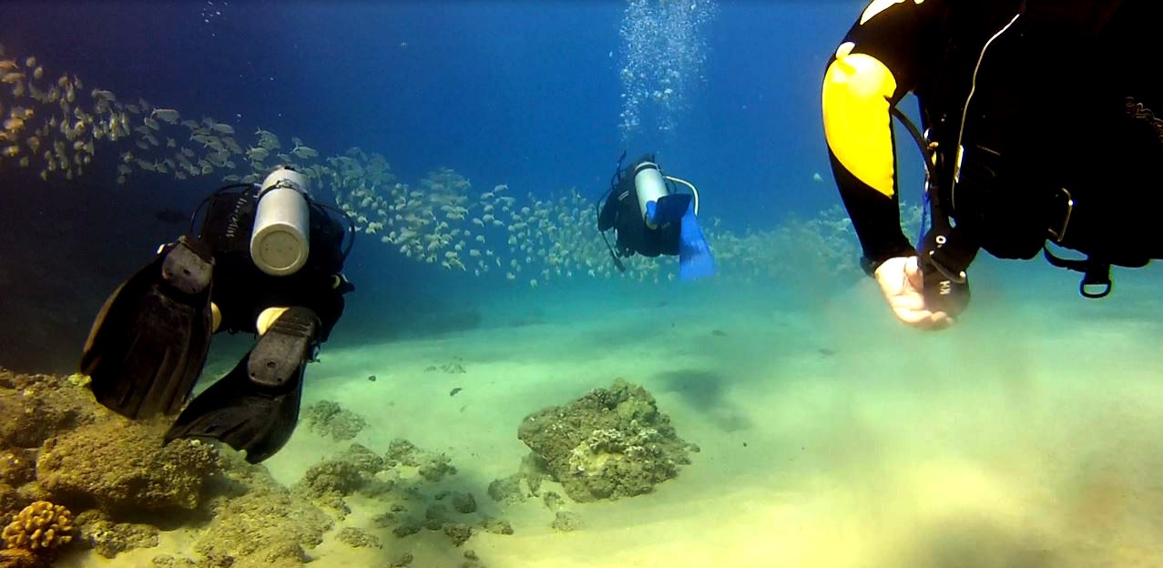 Here is picture from a dive I did off Maui, Hawaii. The place is called Black Rock. That’s me with the yellow and black wetsuit.